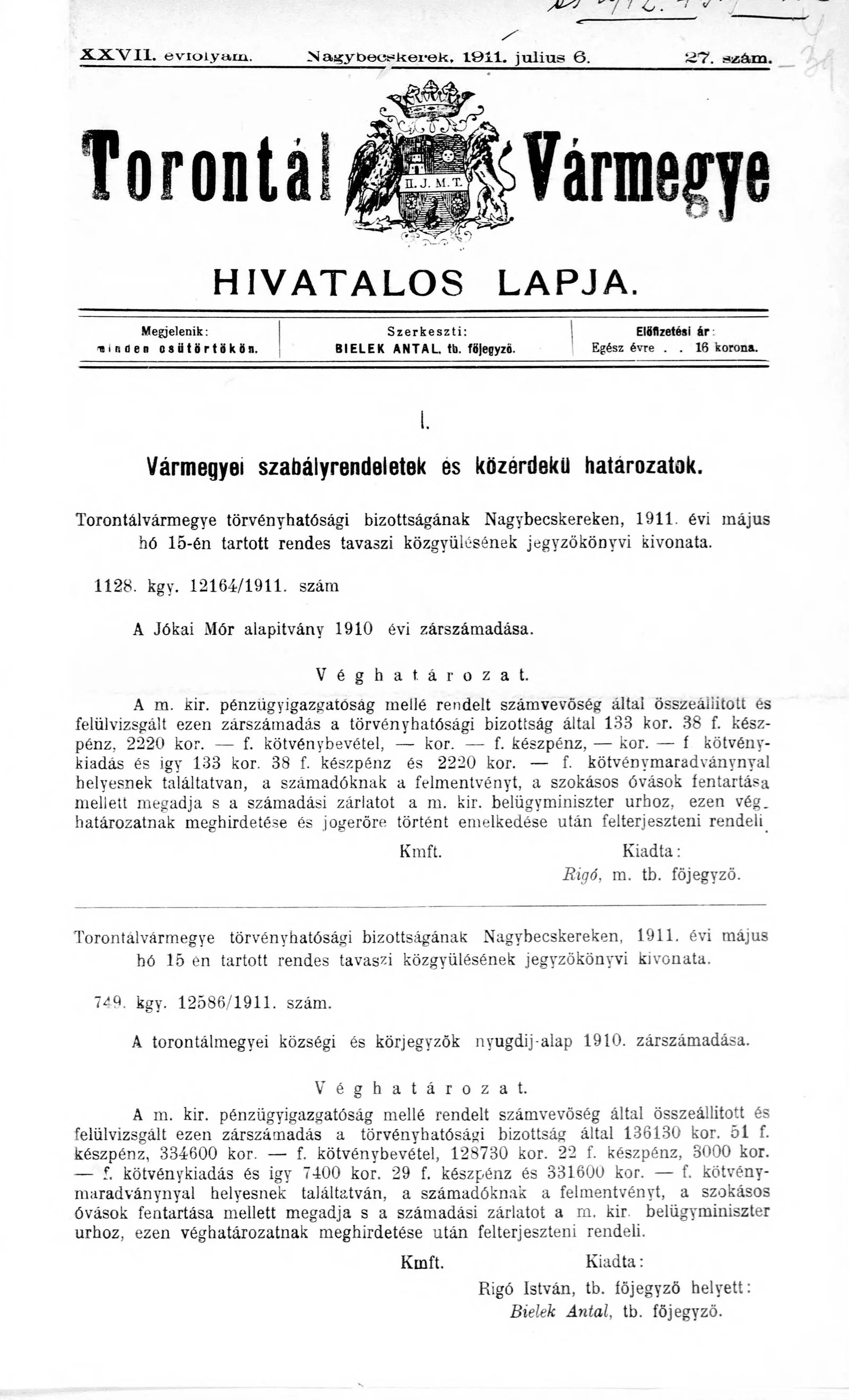 Torontál Vármegye Hivatalos Lapja, 27. évf. 1911. július 6. 27. sz.