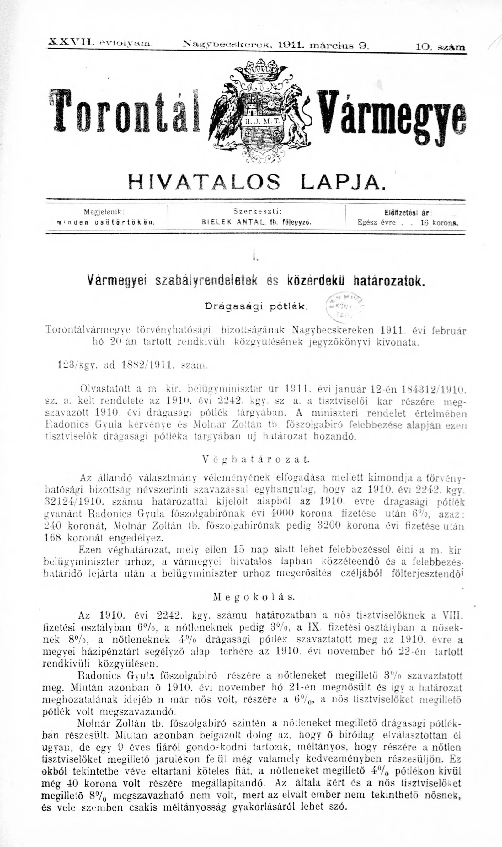 Torontál Vármegye Hivatalos Lapja, 27. évf. 1911. március 9. 10. sz.
