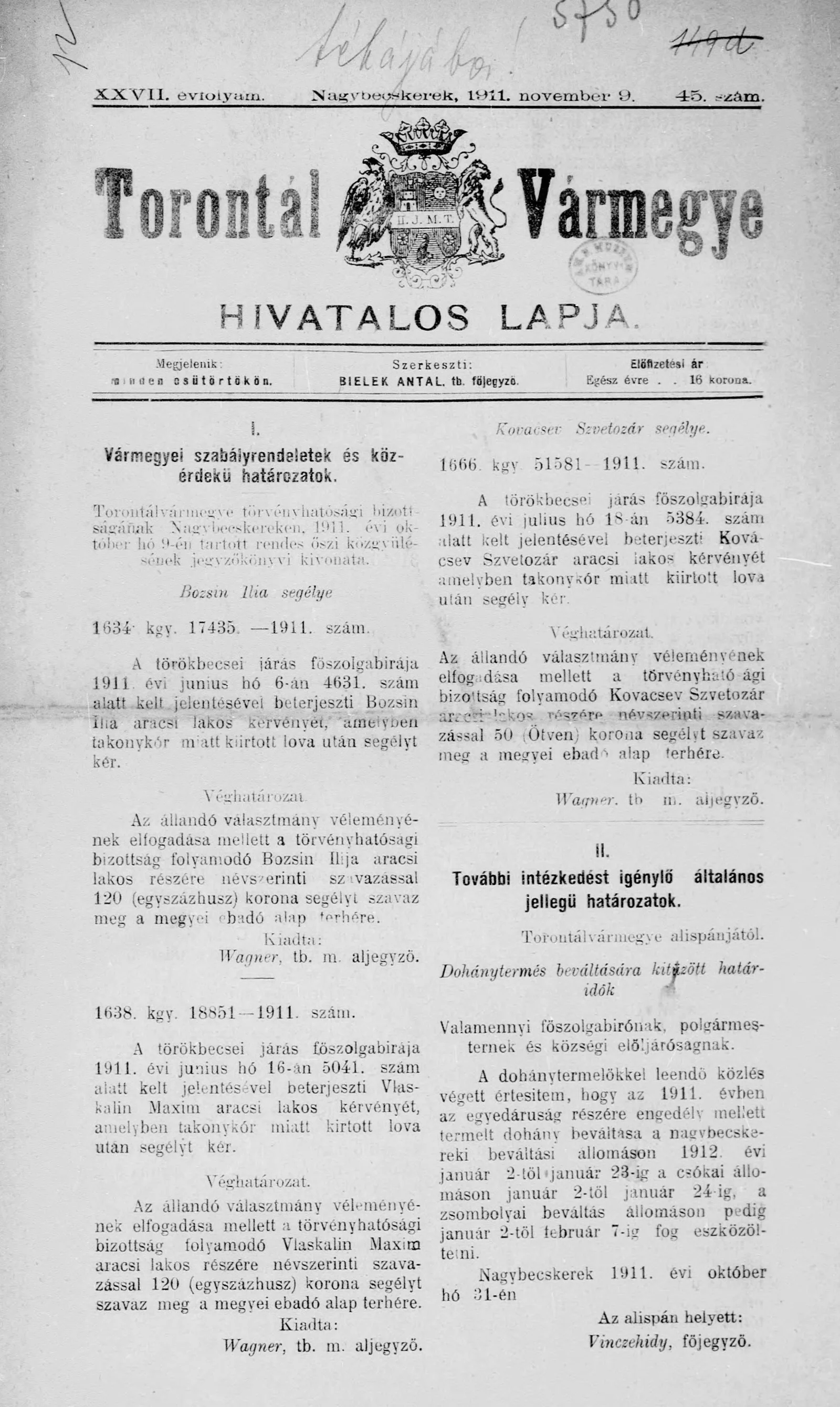 Torontál Vármegye Hivatalos Lapja, 27. évf. 1911. november 9. 45. sz.