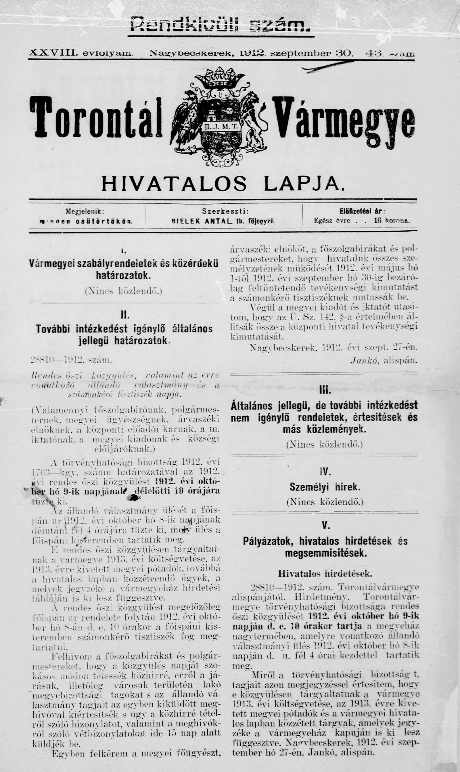 Torontál Vármegye Hivatalos Lapja, 28. évf. 1912. szeptember 30. 43. sz.