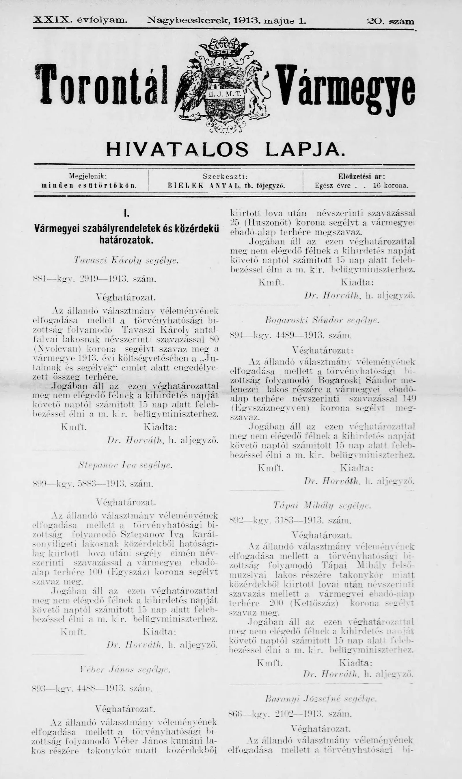 Torontál Vármegye Hivatalos Lapja, 29. évf. 1913. május 1. 20. sz.
