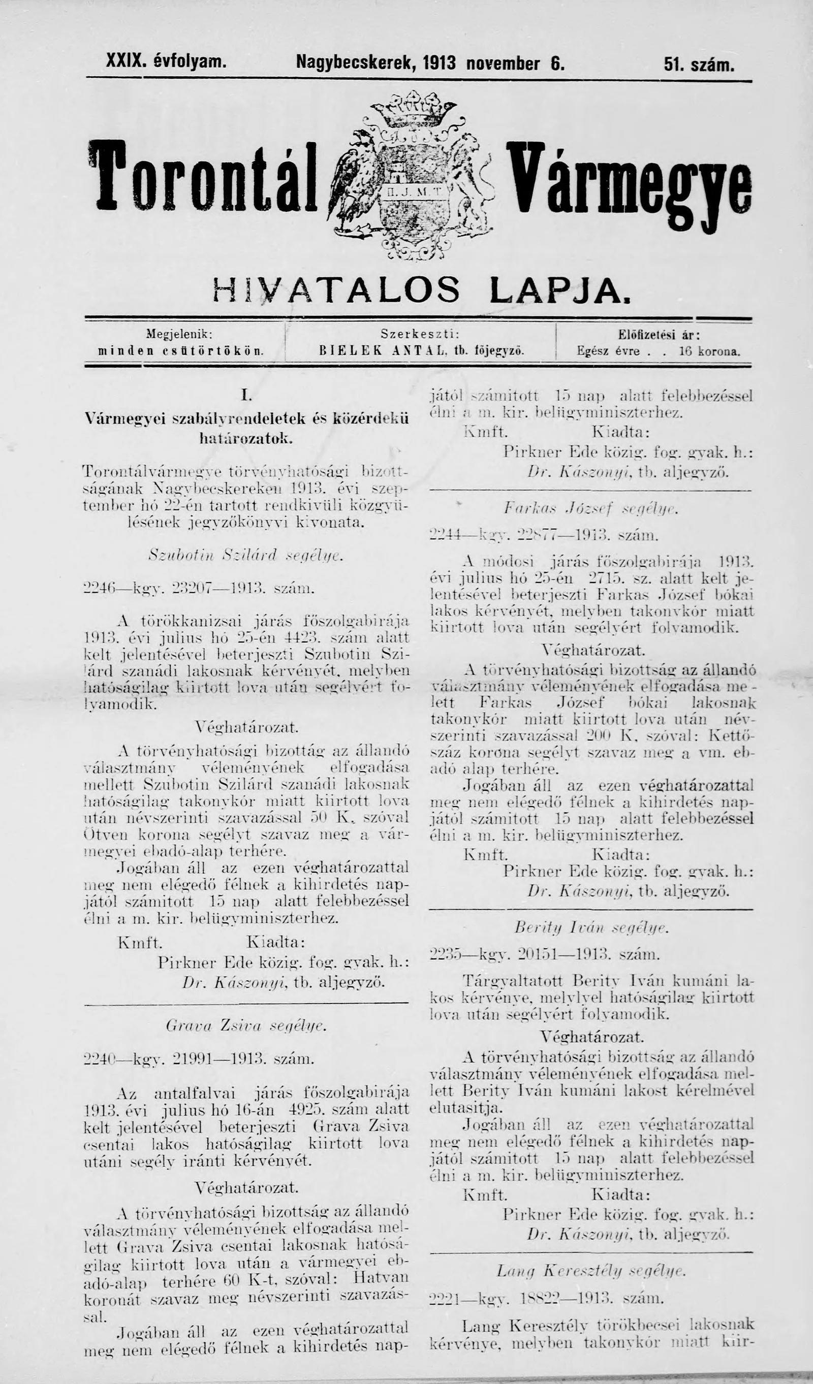Torontál Vármegye Hivatalos Lapja, 29. évf. 1913. november 6. 51. sz.