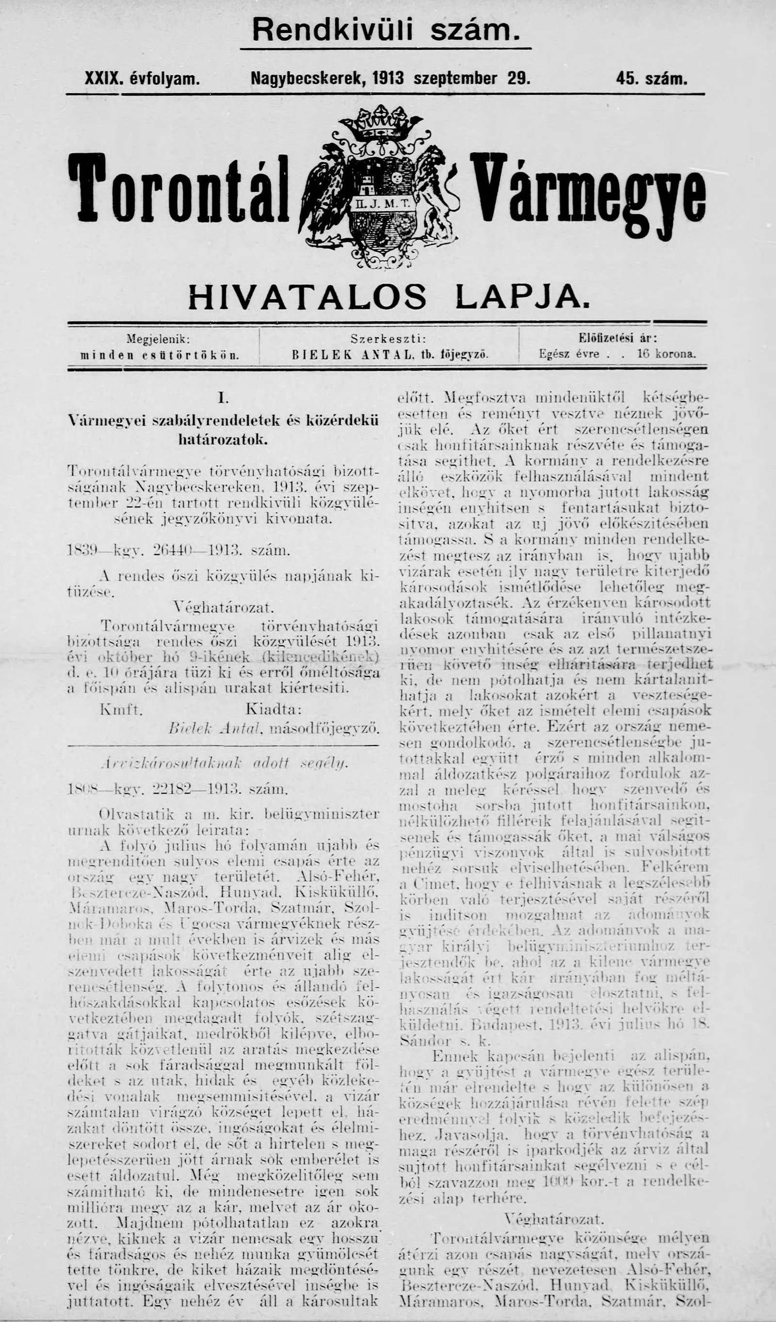 Torontál Vármegye Hivatalos Lapja, 29. évf. 1913. szeptember 29. 45. sz.
