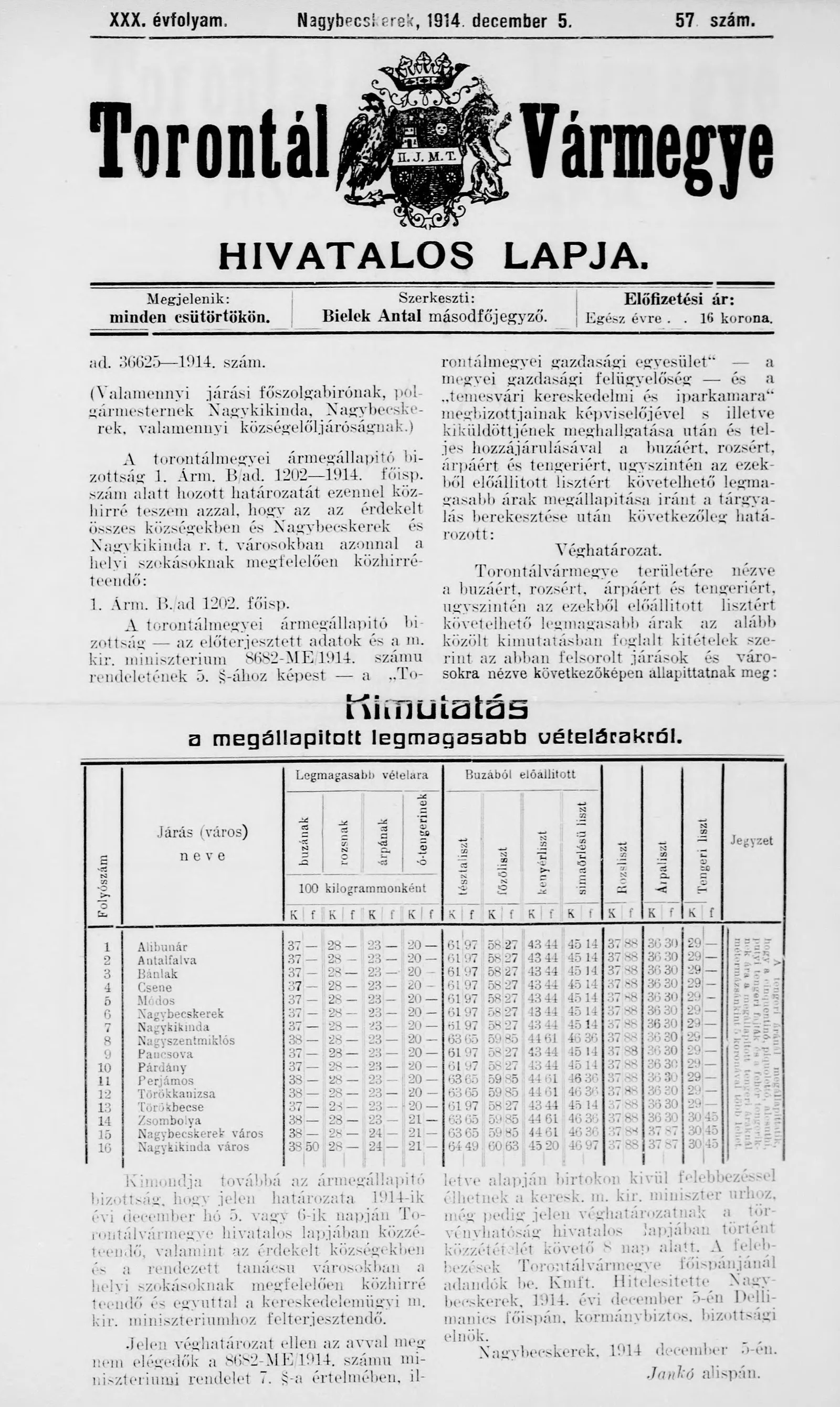 Torontál Vármegye Hivatalos Lapja, 30. évf. 1914. december 5. 57. sz.