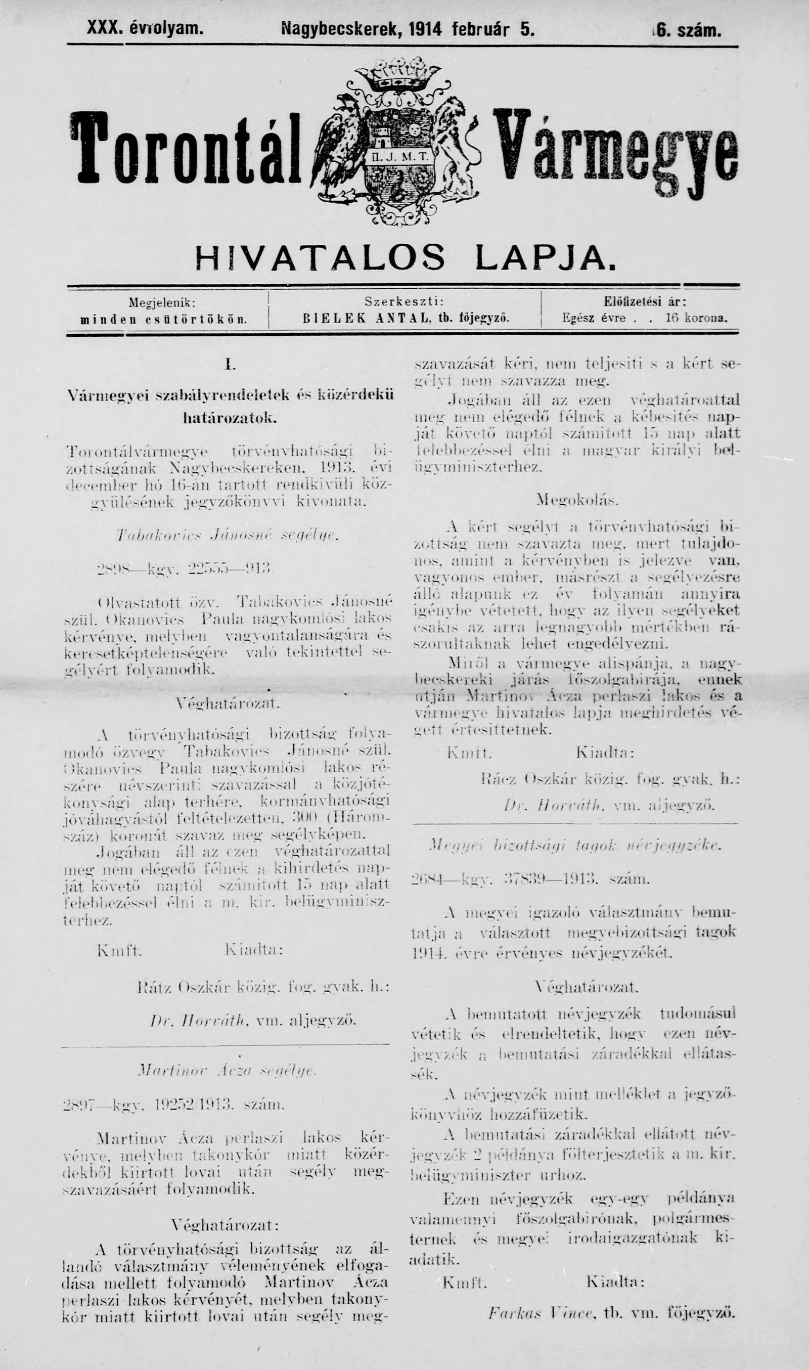 Torontál Vármegye Hivatalos Lapja, 30. évf. 1914. február 5. 6. sz.