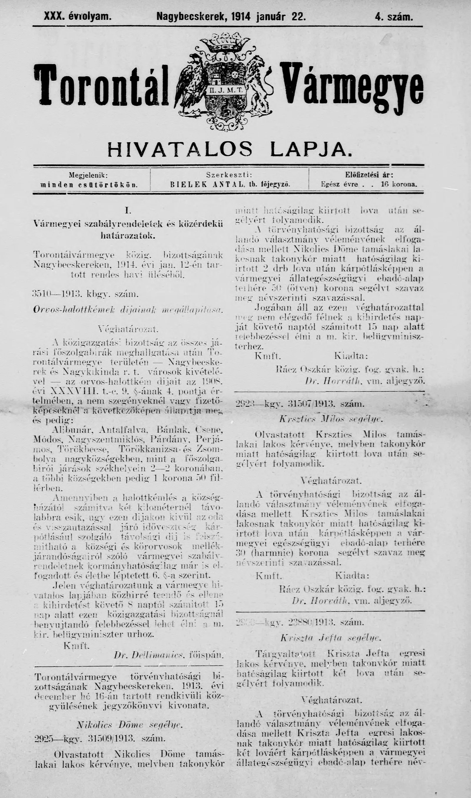 Torontál Vármegye Hivatalos Lapja, 30. évf. 1914. január 22. 4. sz.