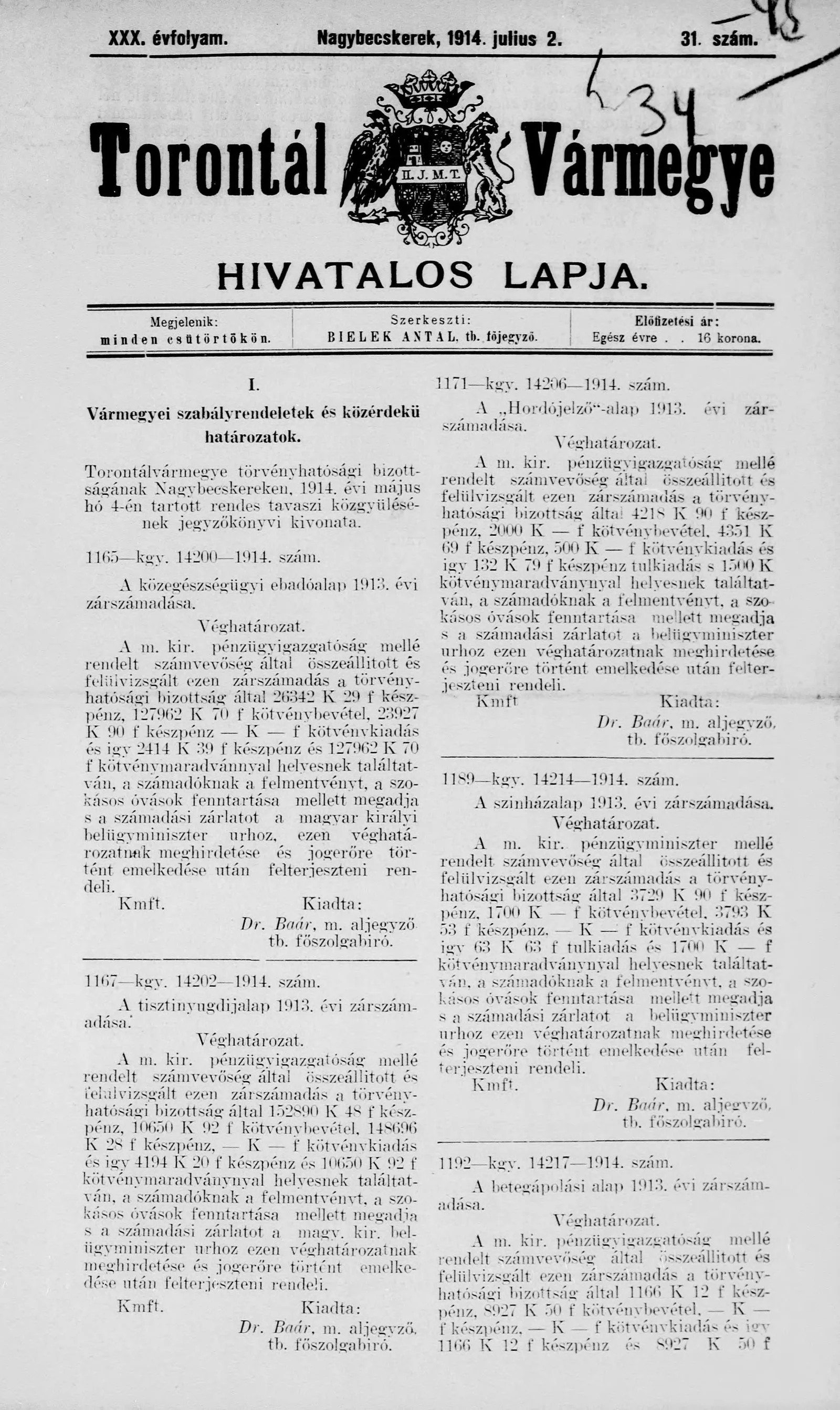 Torontál Vármegye Hivatalos Lapja, 30. évf. 1914. július 2. 31. sz.