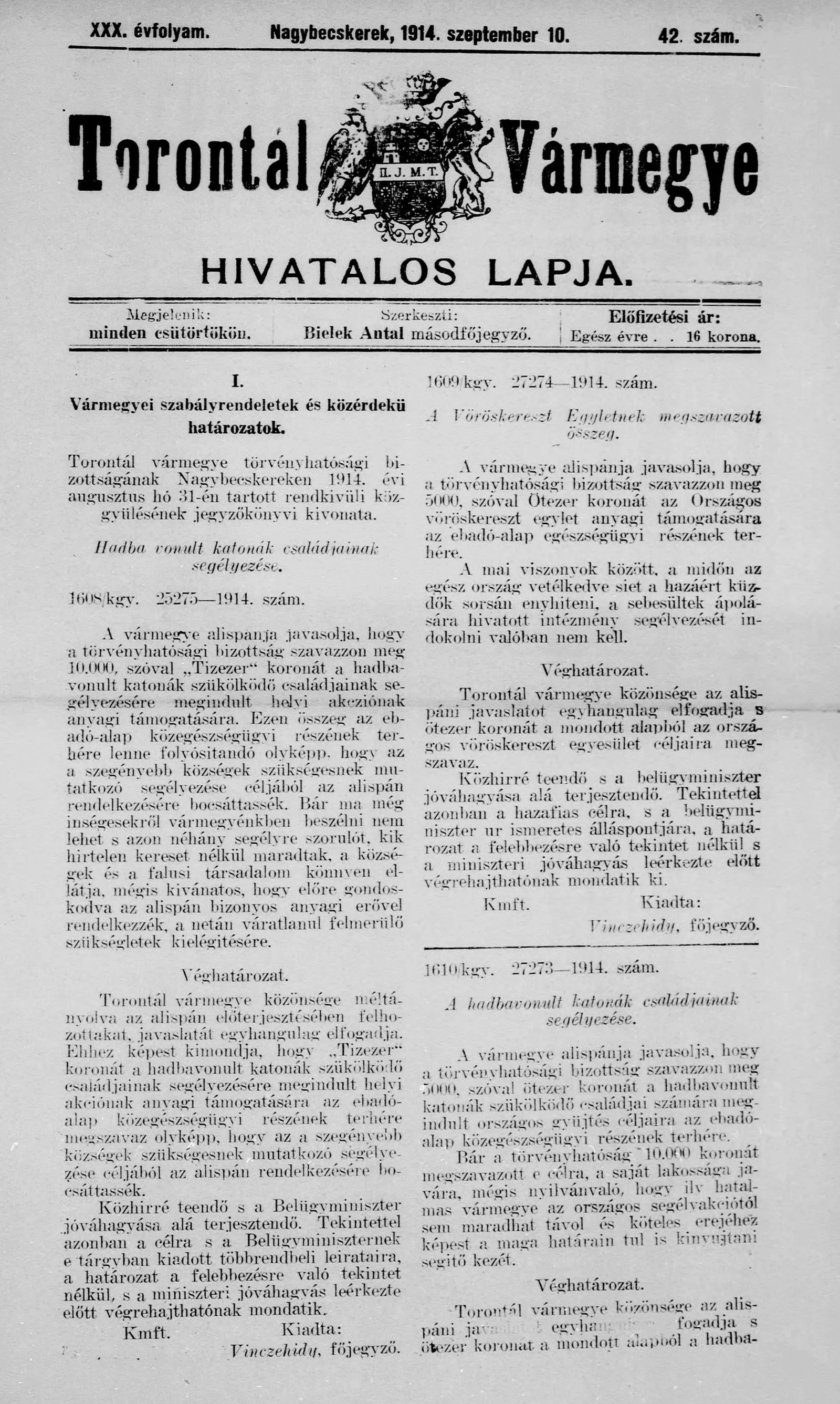 Torontál Vármegye Hivatalos Lapja, 30. évf. 1914. szeptember 10. 42. sz.