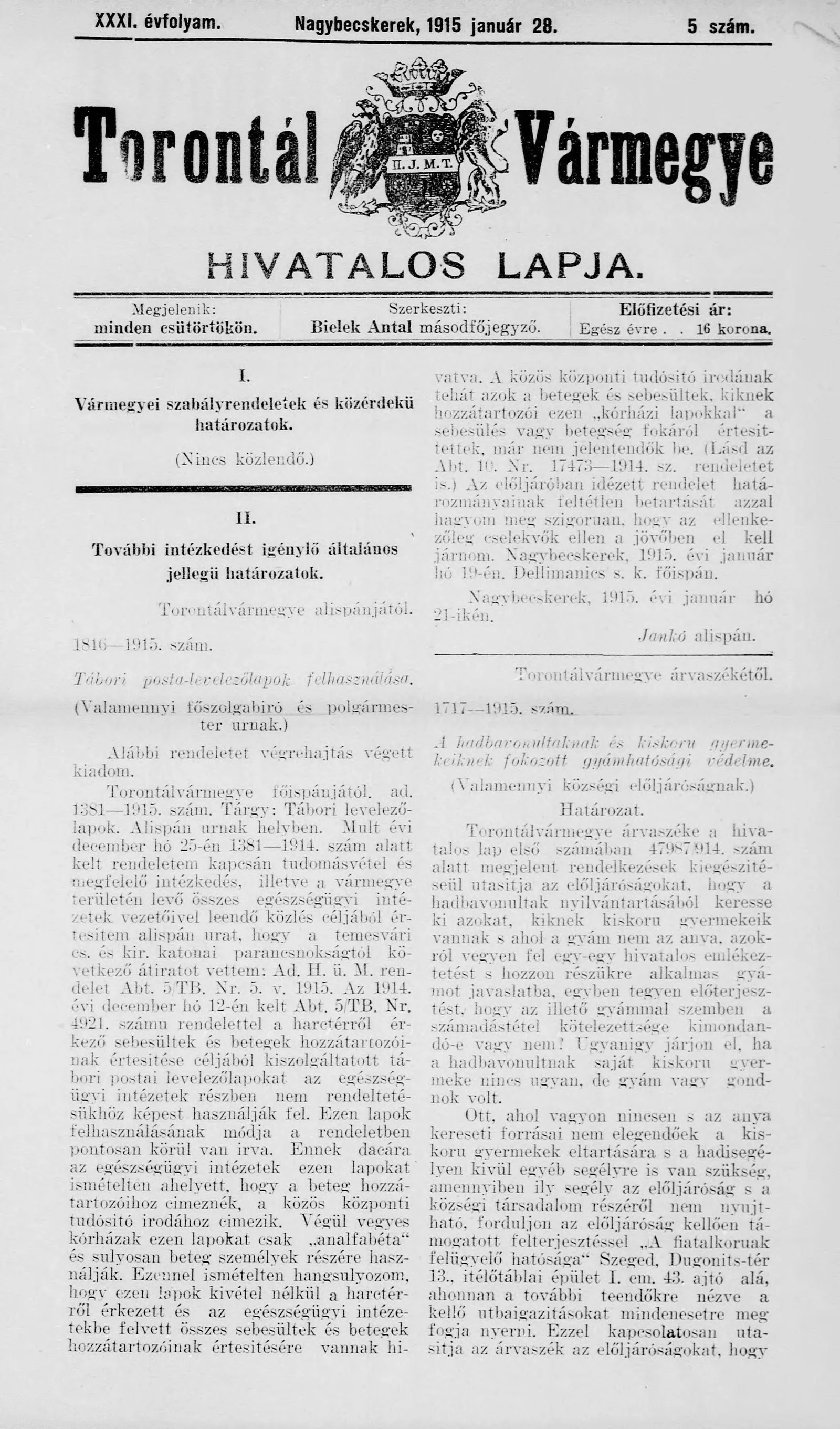 Torontál Vármegye Hivatalos Lapja, 31. évf. 1915. január 28. 5. sz.