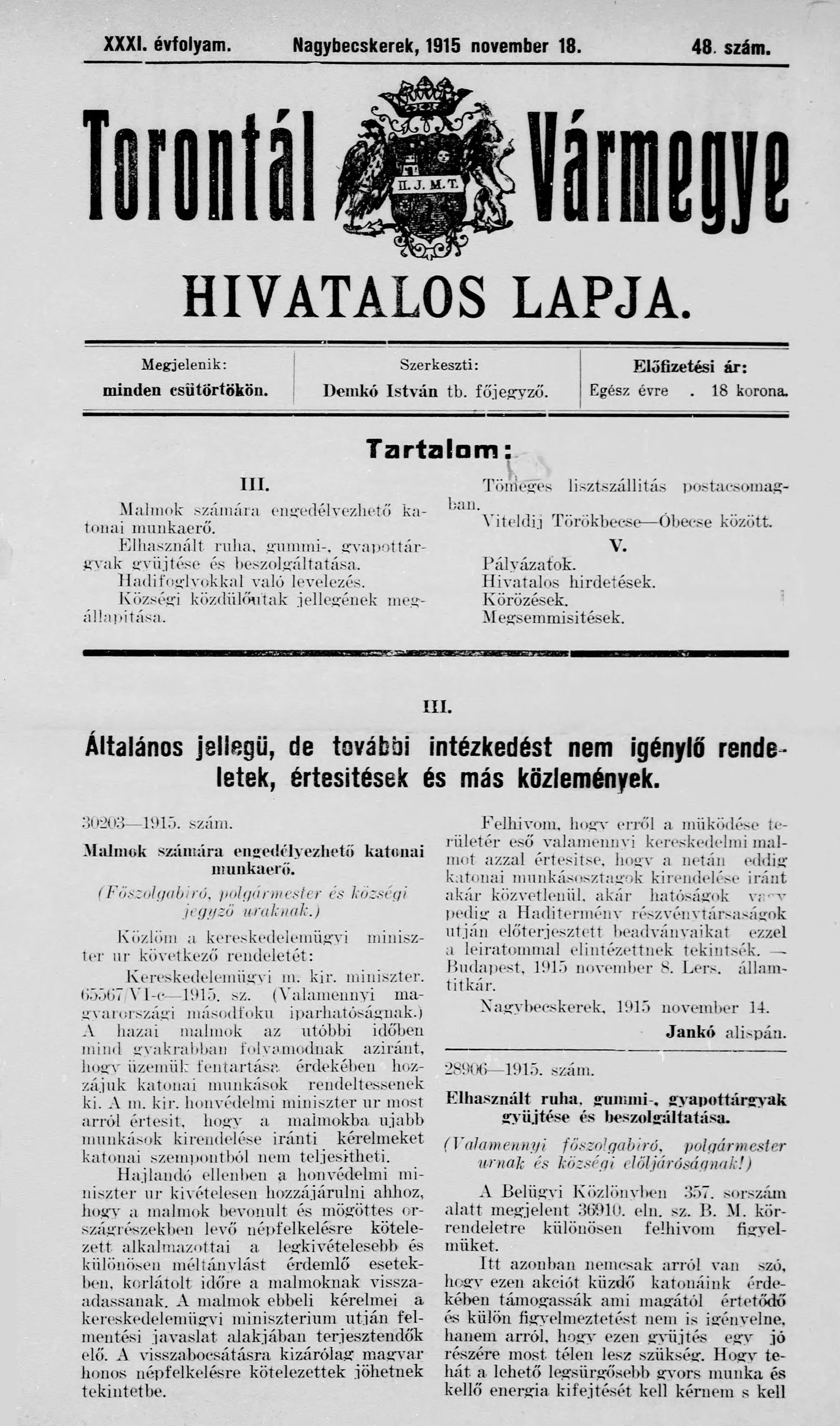 Torontál Vármegye Hivatalos Lapja, 31. évf. 1915. november 18. 48. sz.