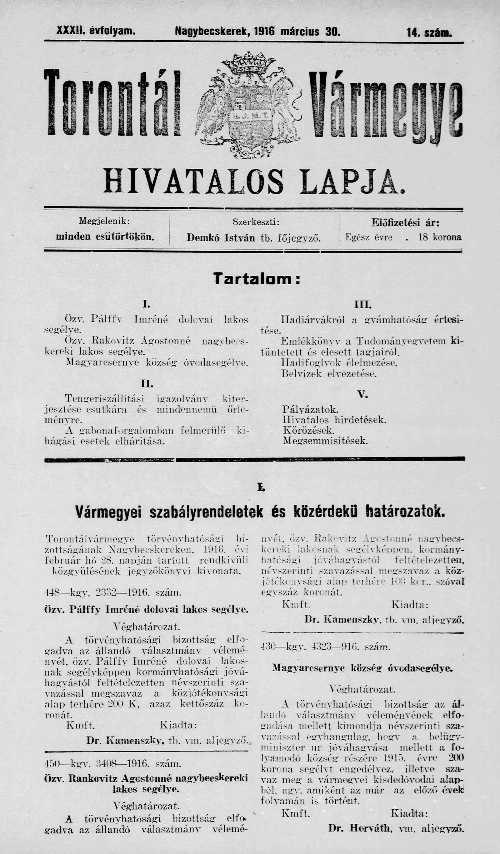 Torontál Vármegye Hivatalos Lapja, 32. évf. 1916. március 30. 14. sz.
