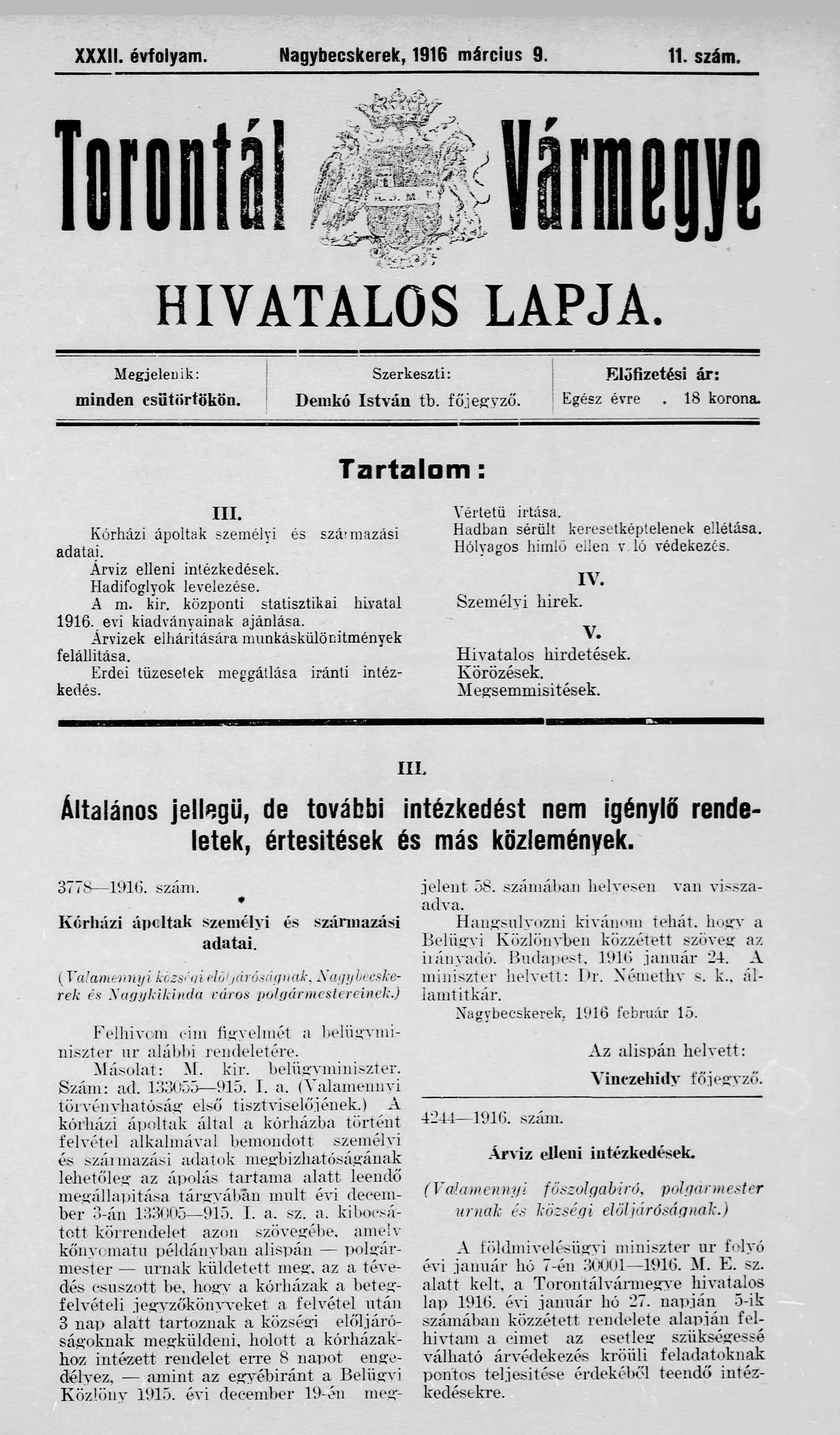 Torontál Vármegye Hivatalos Lapja, 32. évf. 1916. március 9. 11. sz.