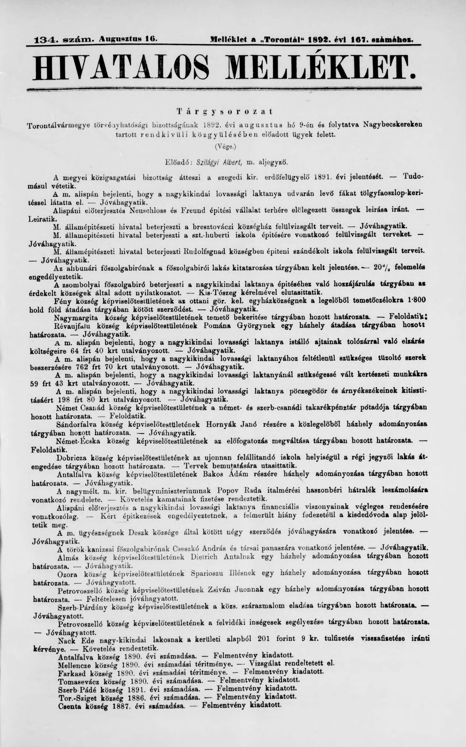 A Totontál hivatalos melléklete, 5. évf. 1892. augusztus 16. 134. sz.