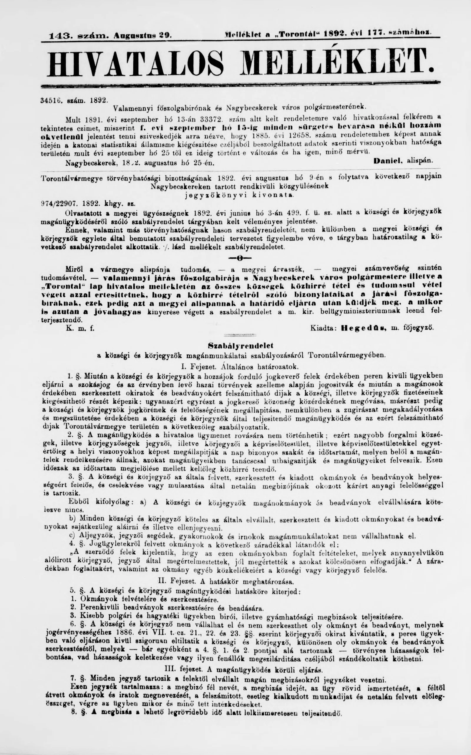 A Totontál hivatalos melléklete, 5. évf. 1892. augusztus 29. 143. sz.