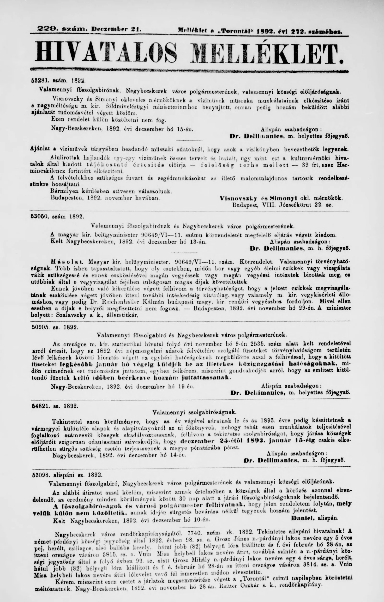 A Totontál hivatalos melléklete, 5. évf. 1892. december 21. 229. sz.