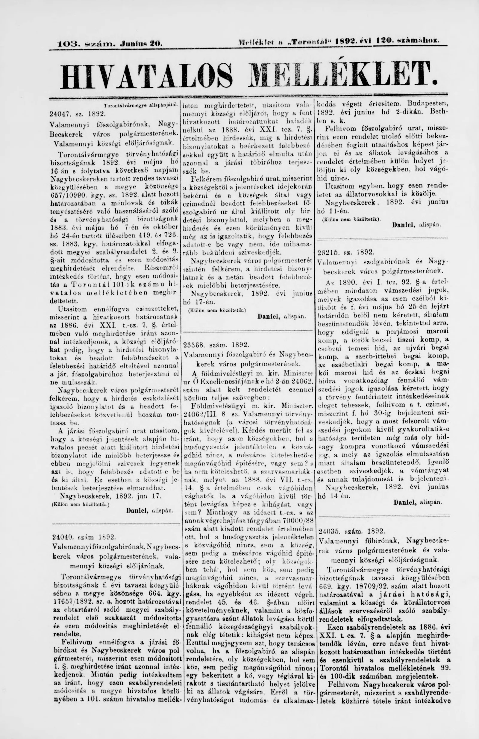 A Totontál hivatalos melléklete, 5. évf. 1892. június 20. 103. sz.