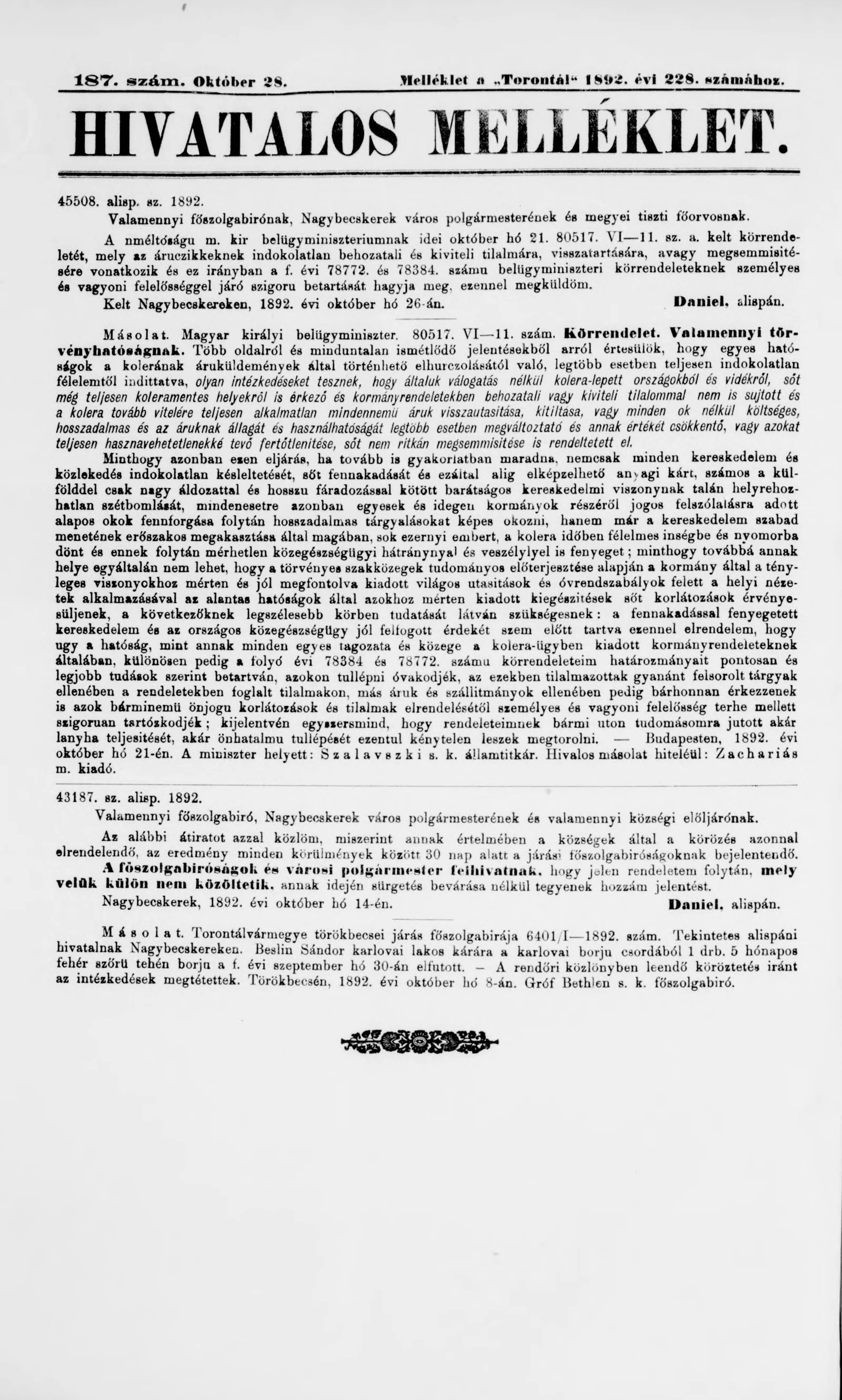 A Totontál hivatalos melléklete, 5. évf. 1892. október 28. 187. sz.