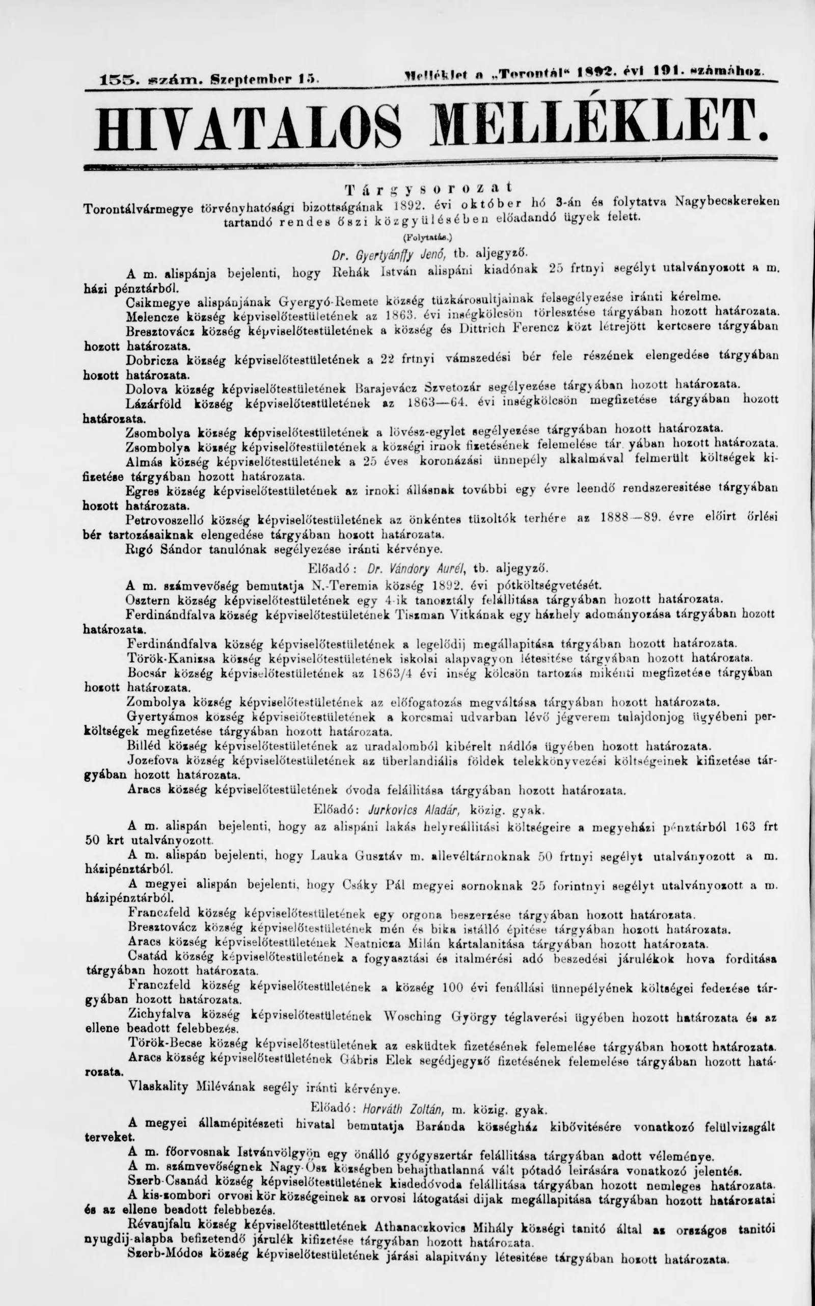 A Totontál hivatalos melléklete, 5. évf. 1892. szeptember 15. 155. sz.