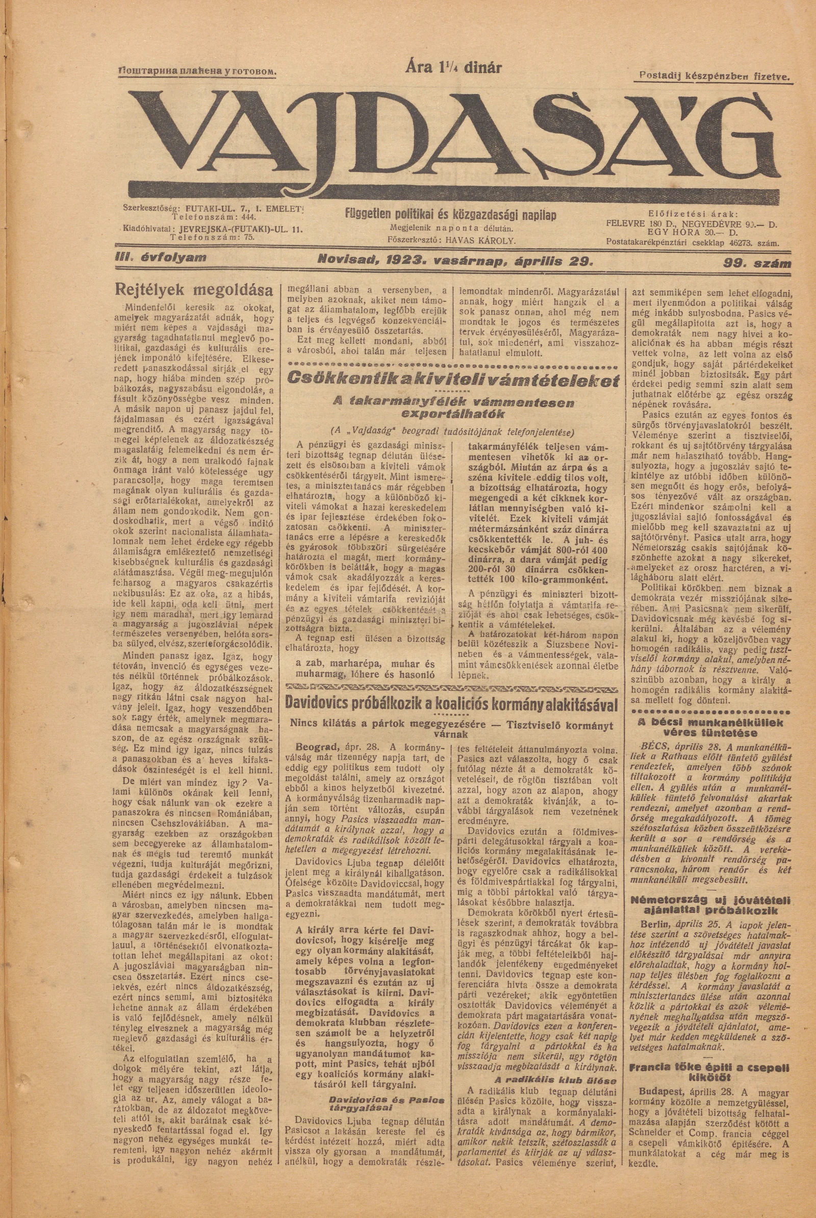 Vajdaság, 3. évf. 1923. április 29. 99. sz.