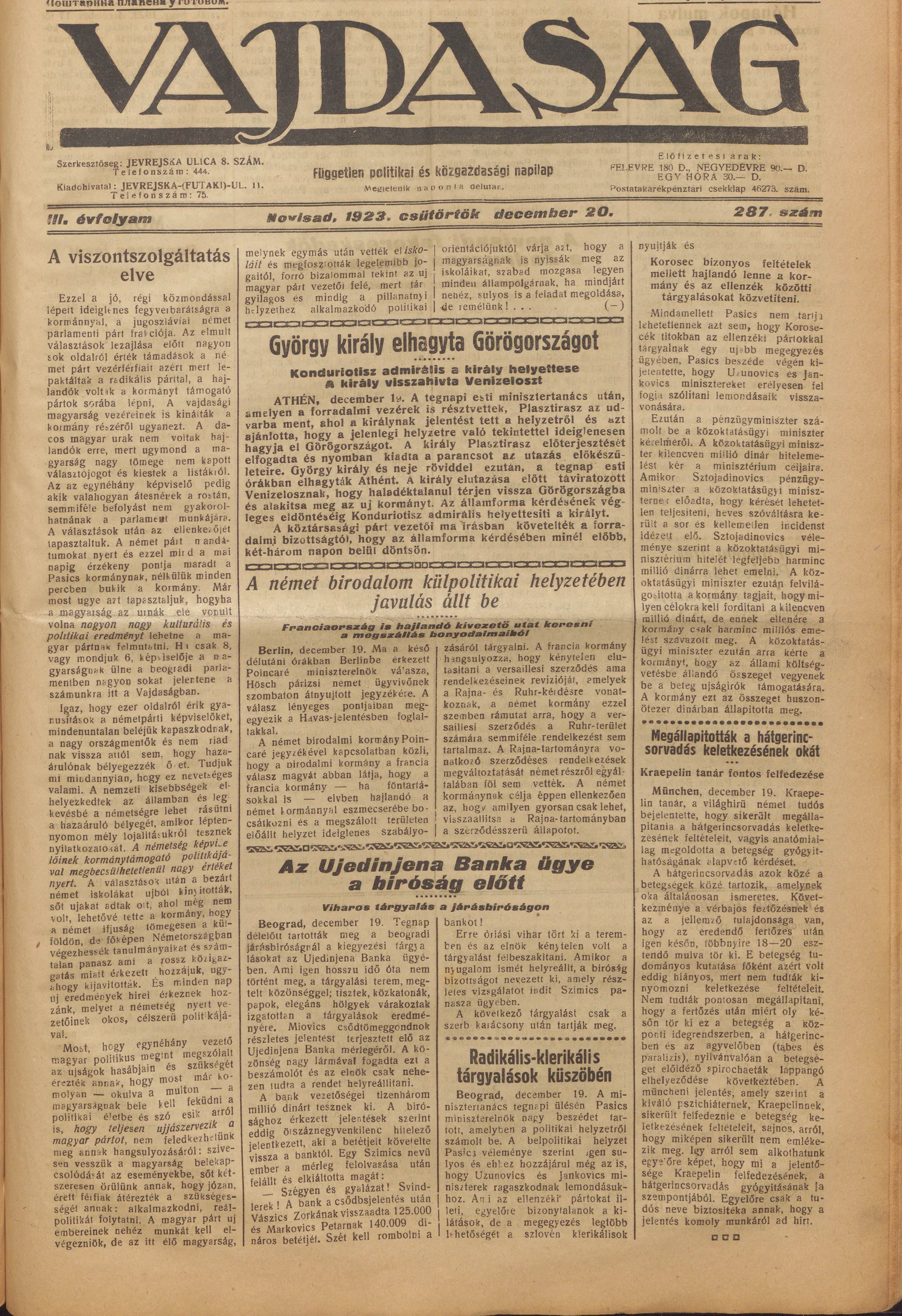 Vajdaság, 3. évf. 1923. december 20. 287. sz.