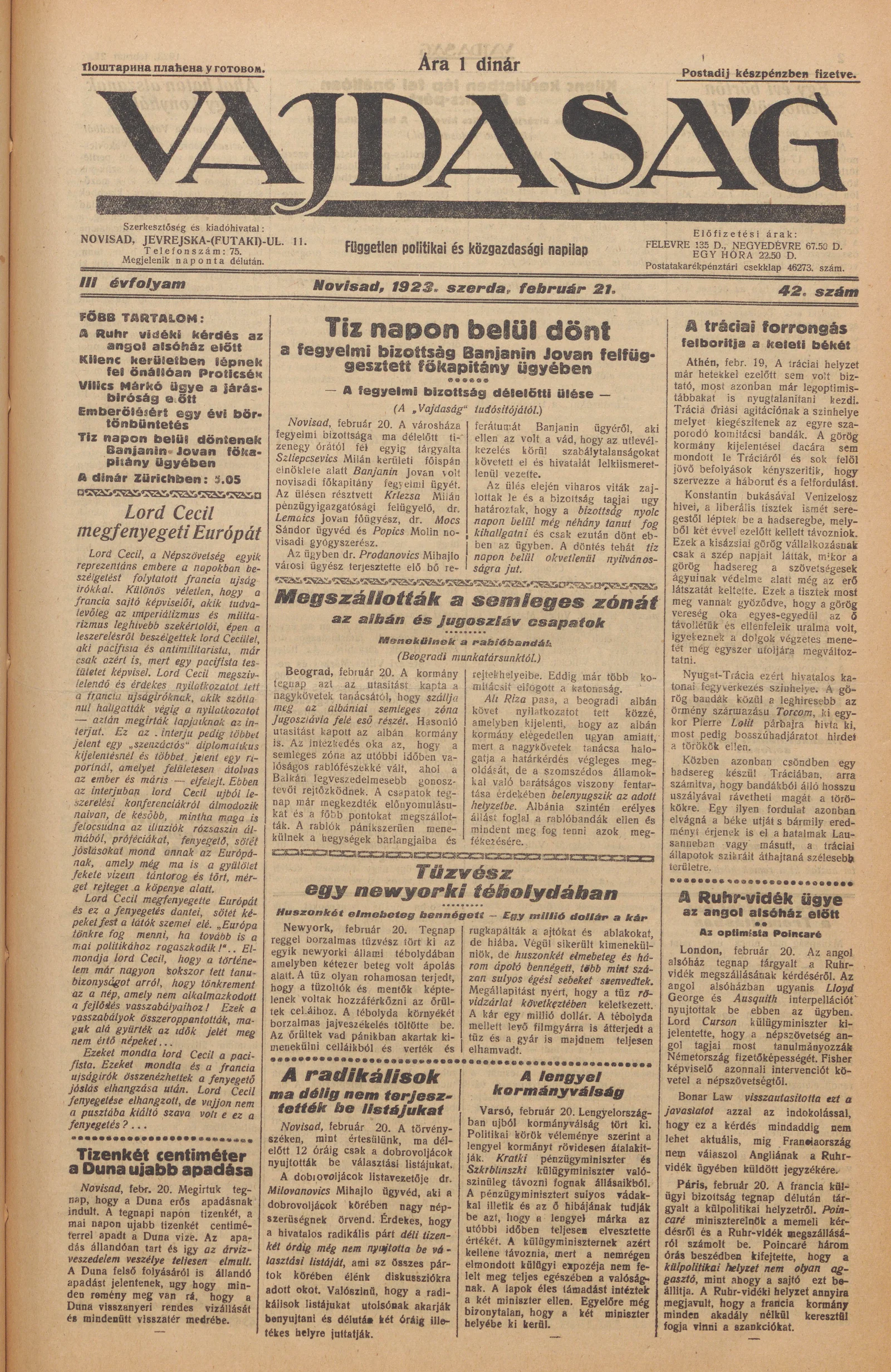 Vajdaság, 3. évf. 1923. február 21. 42. sz.