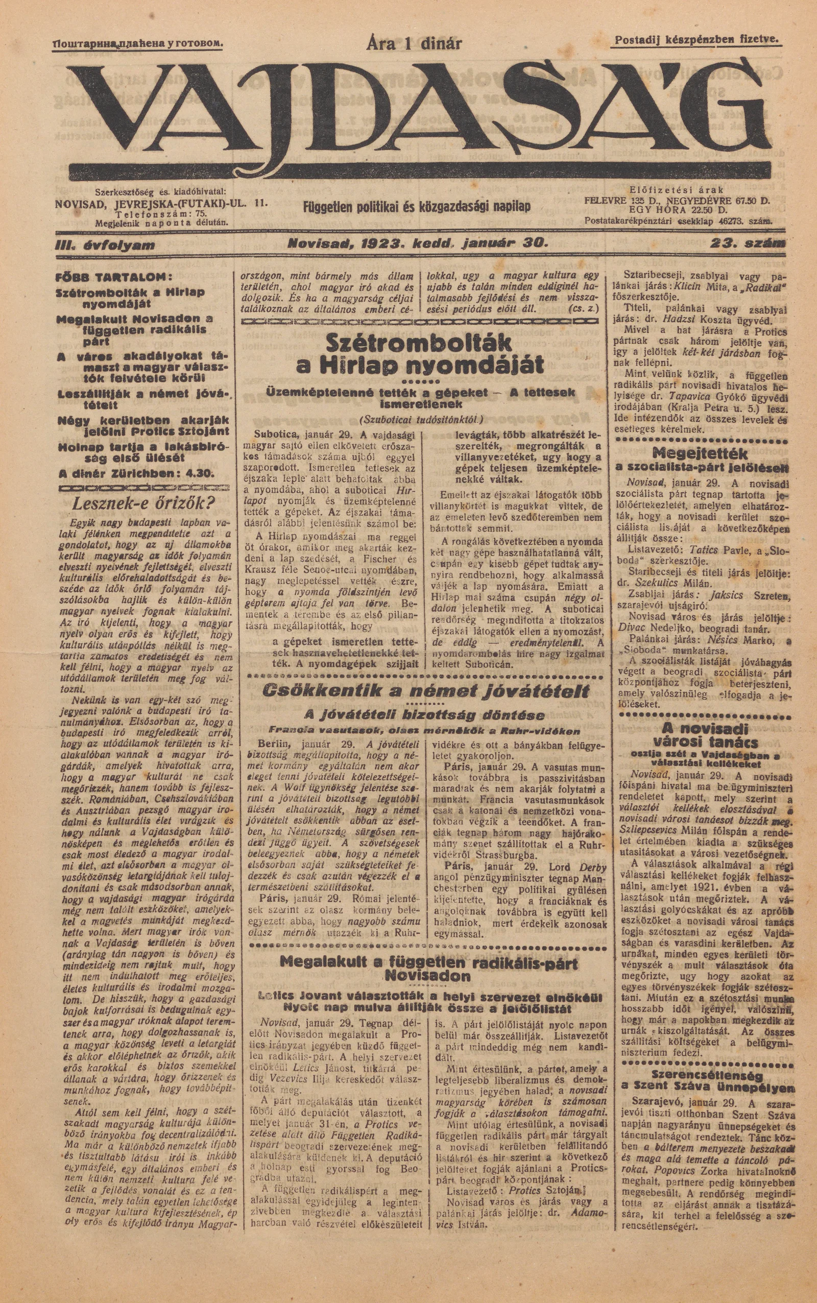 Vajdaság, 3. évf. 1923. január 30. 23. sz.