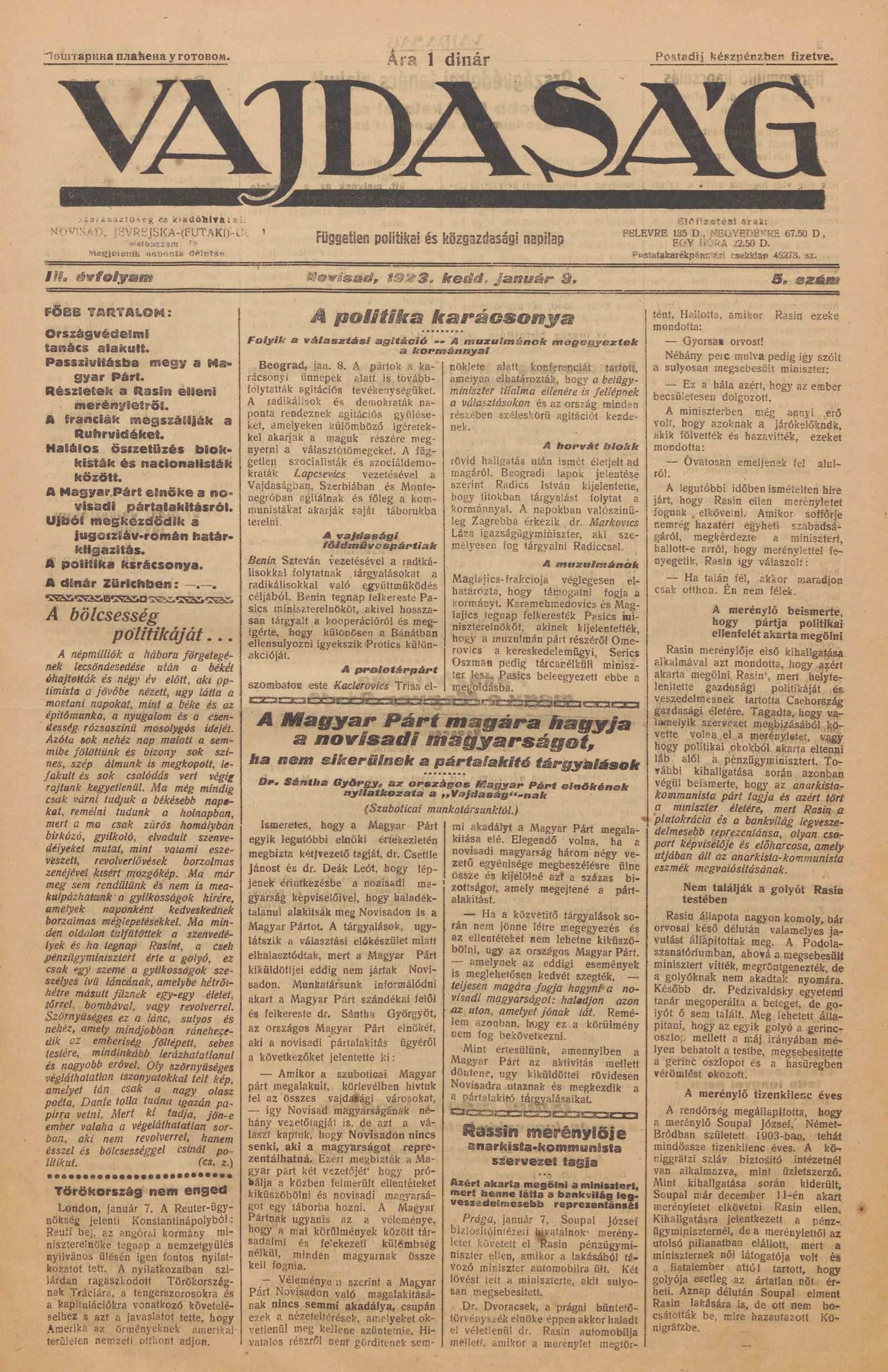 Vajdaság, 3. évf. 1923. január 9. 5. sz.