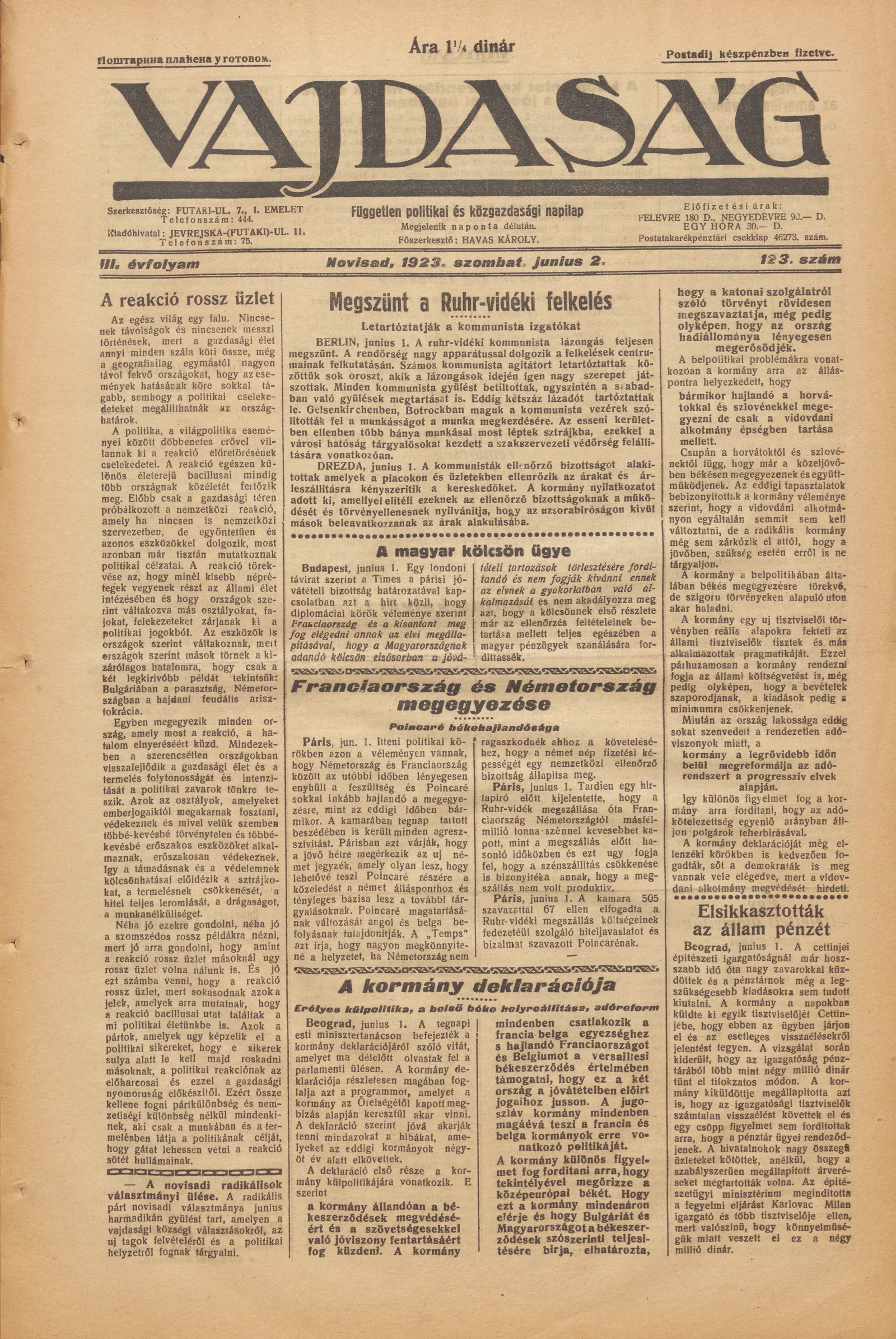 Vajdaság, 3. évf. 1923. július 2. 123. sz.