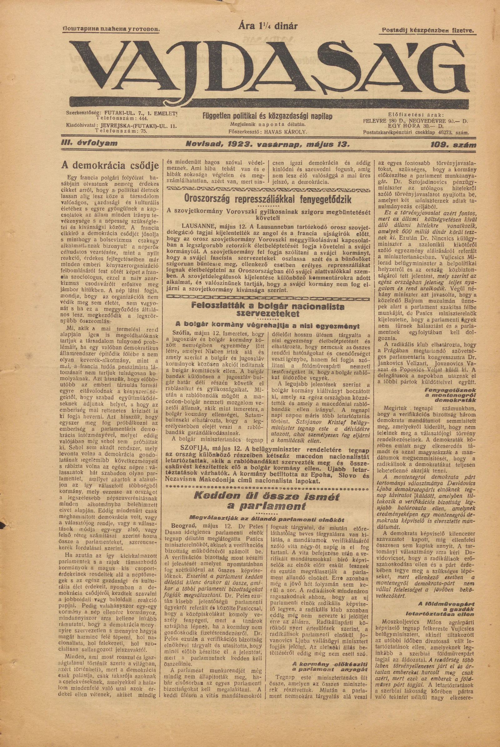 Vajdaság, 3. évf. 1923. május 13. 109. sz.