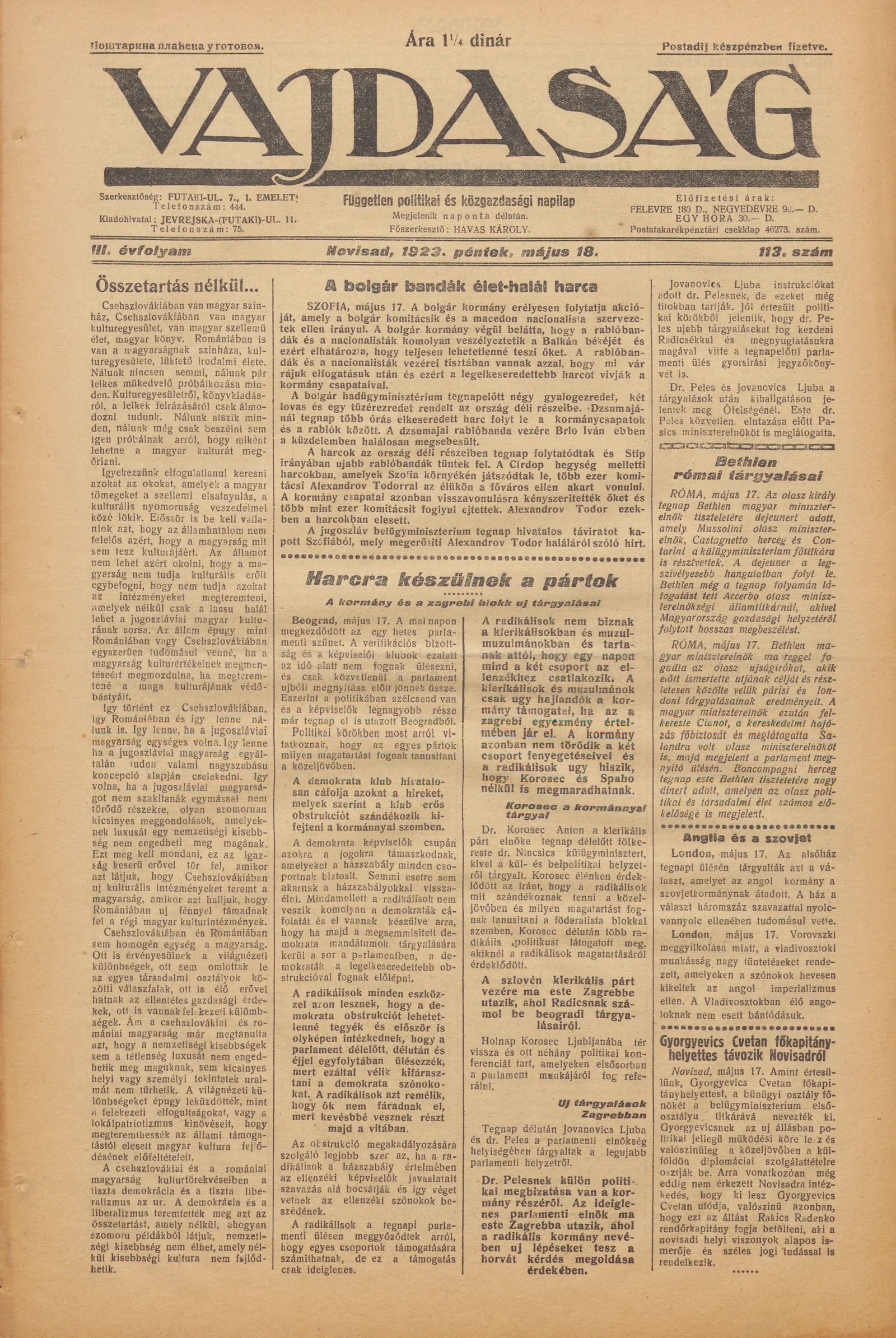 Vajdaság, 3. évf. 1923. május 18. 113. sz.