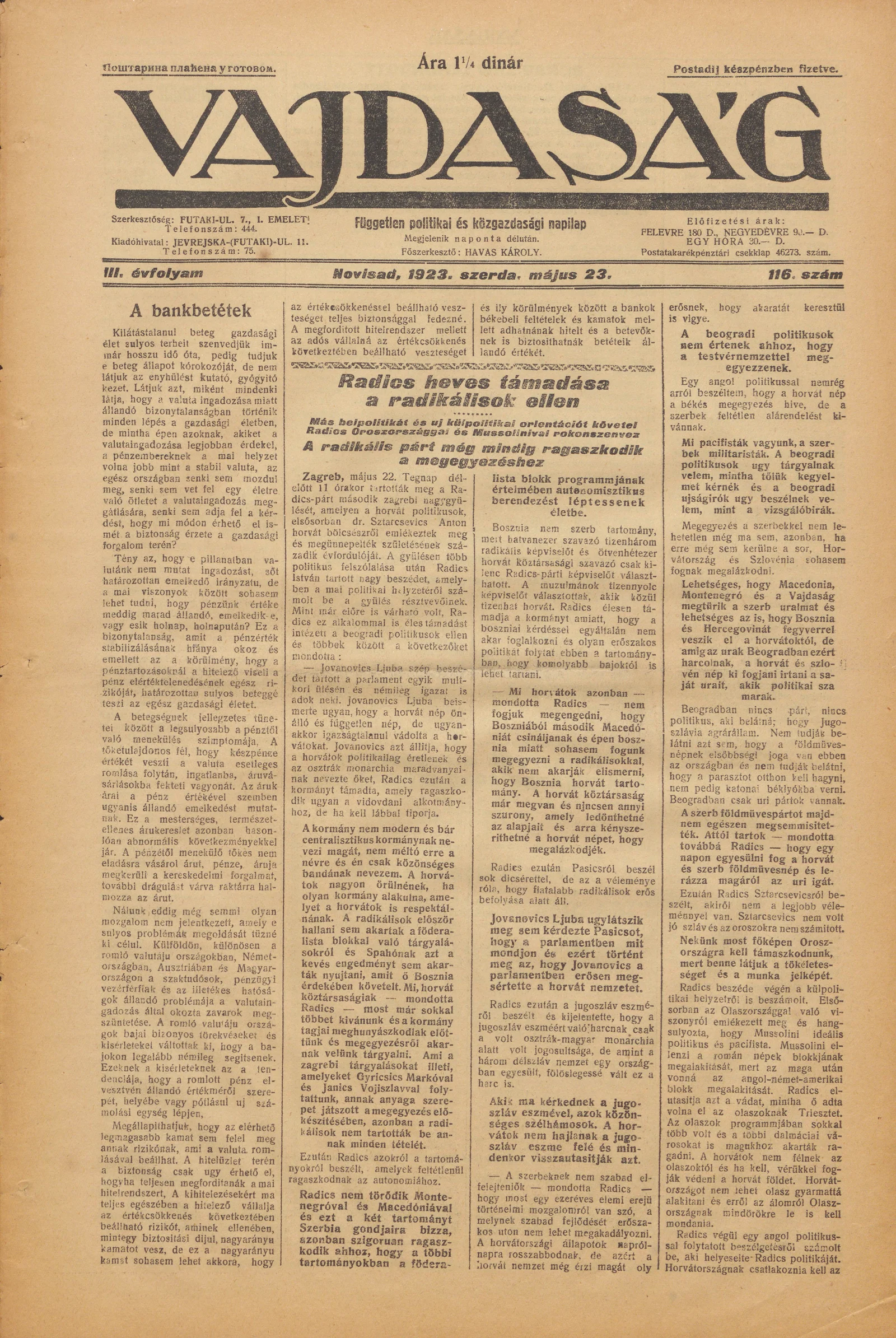 Vajdaság, 3. évf. 1923. május 23. 116. sz.