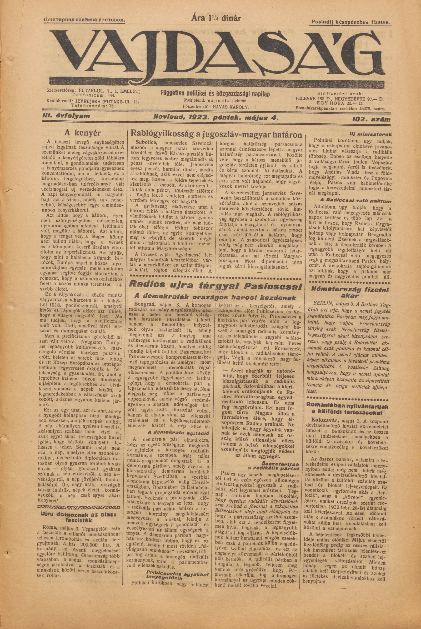 Vajdaság, 3. évf. 1923. május 4. 102. sz.