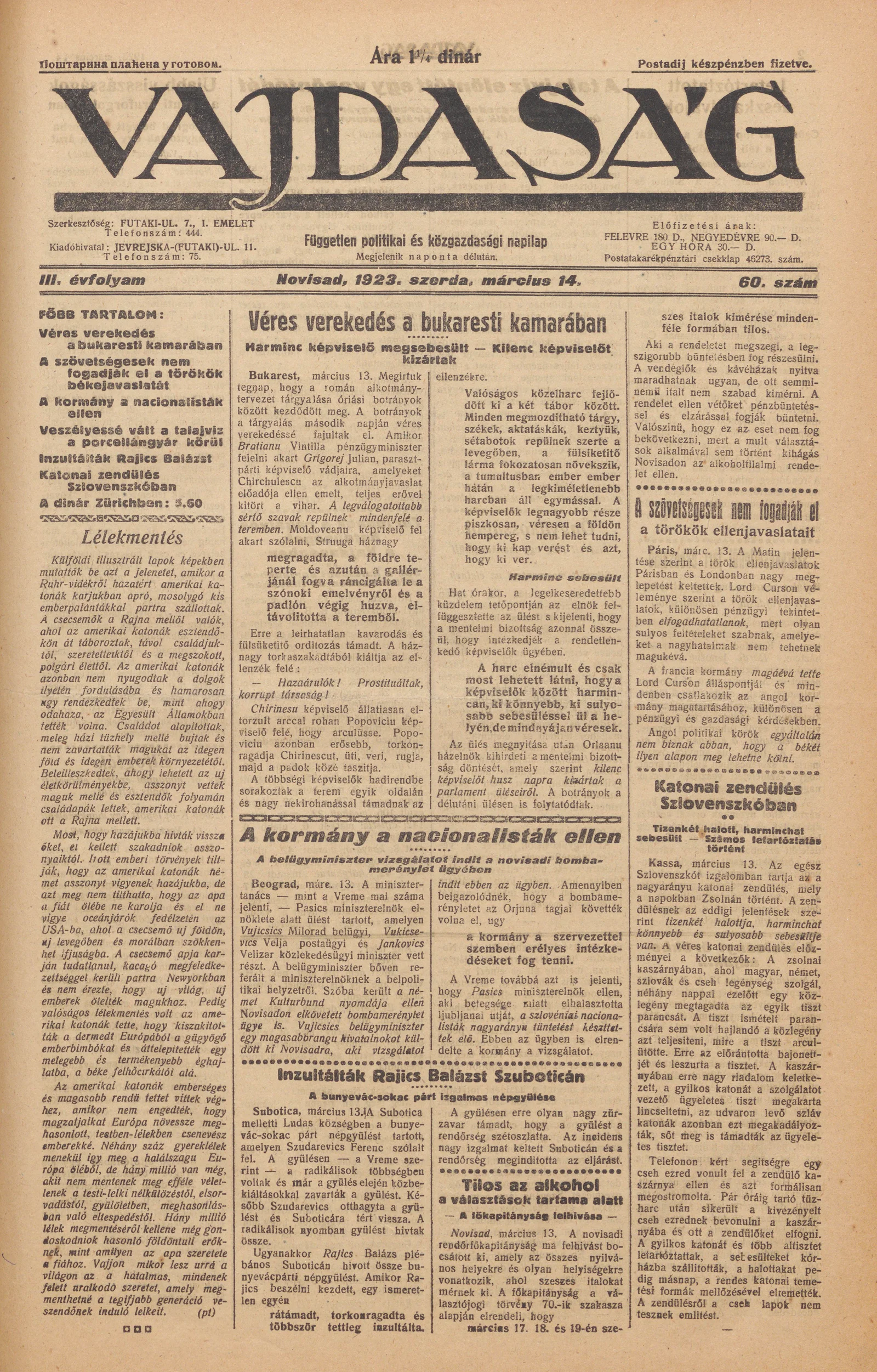 Vajdaság, 3. évf. 1923. március 14. 60. sz.