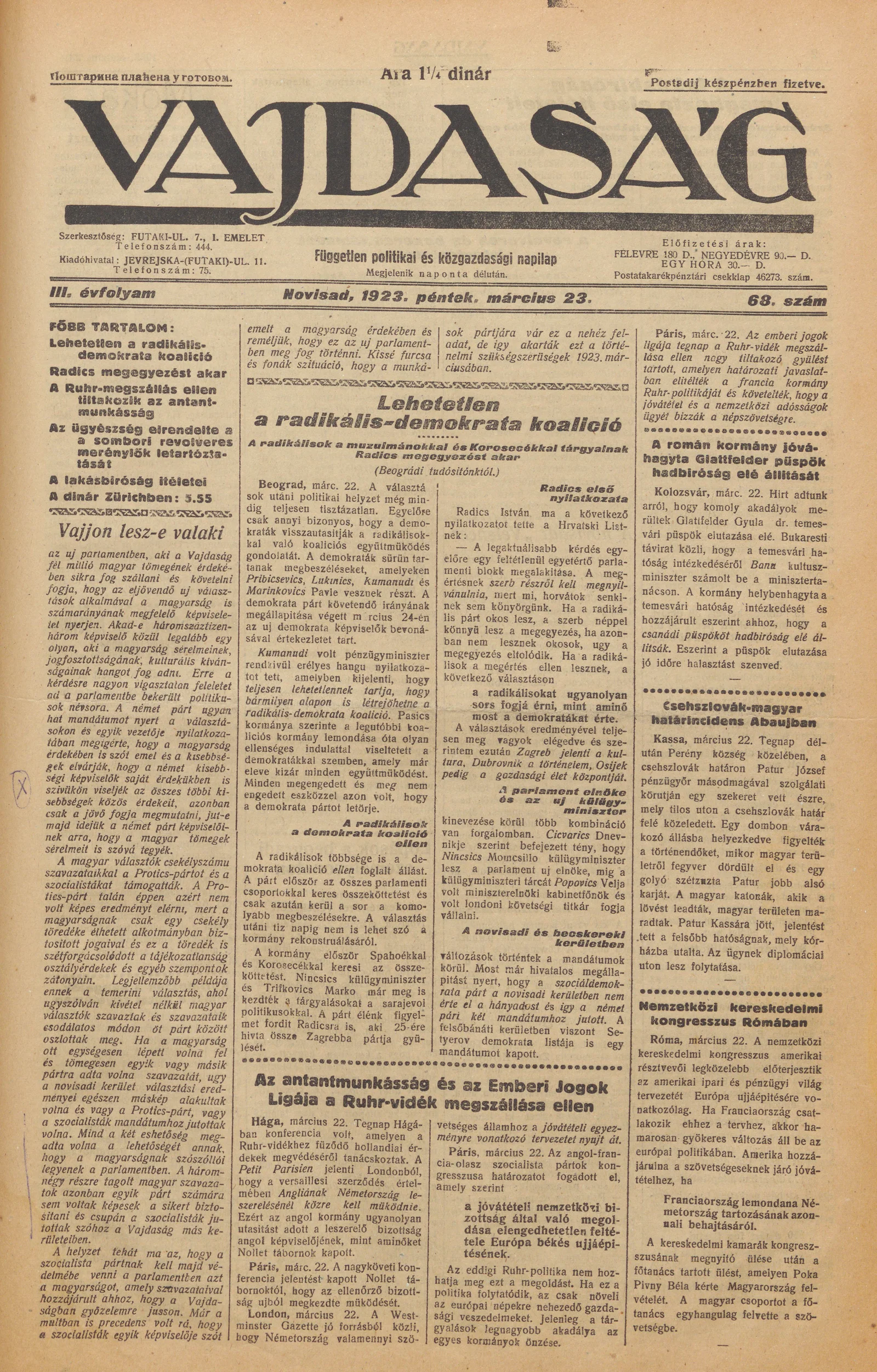 Vajdaság, 3. évf. 1923. március 23. 68. sz.