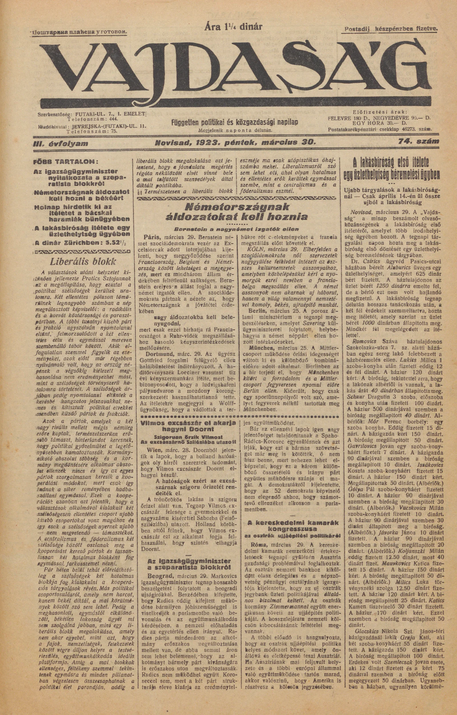 Vajdaság, 3. évf. 1923. március 30. 74. sz.