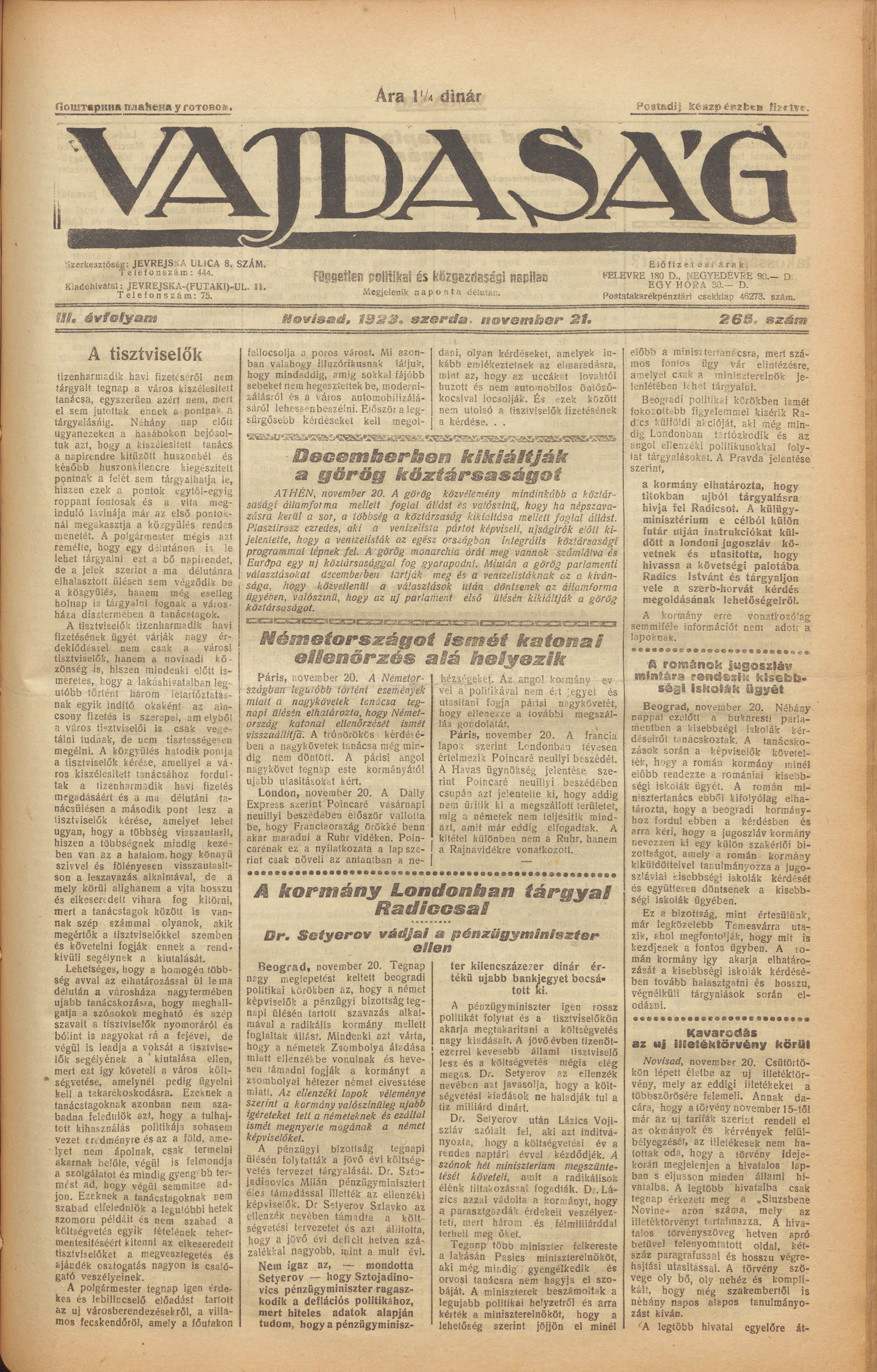 Vajdaság, 3. évf. 1923. november 21. 265. sz.