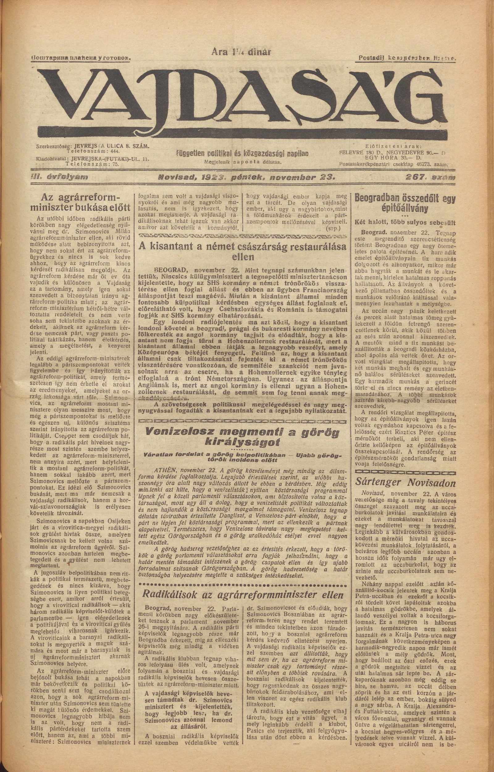 Vajdaság, 3. évf. 1923. november 23. 267. sz.