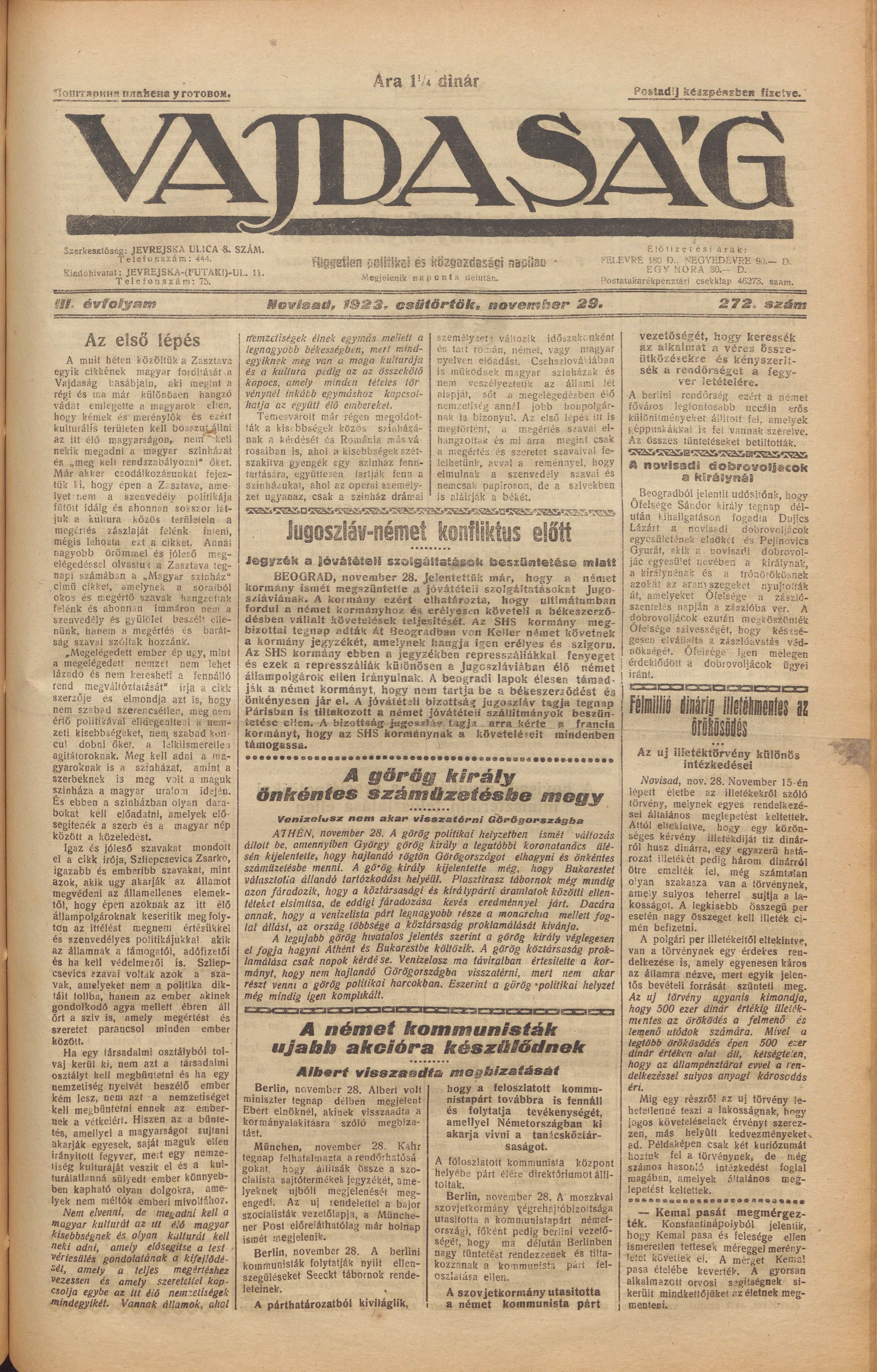 Vajdaság, 3. évf. 1923. november 29. 272. sz.
