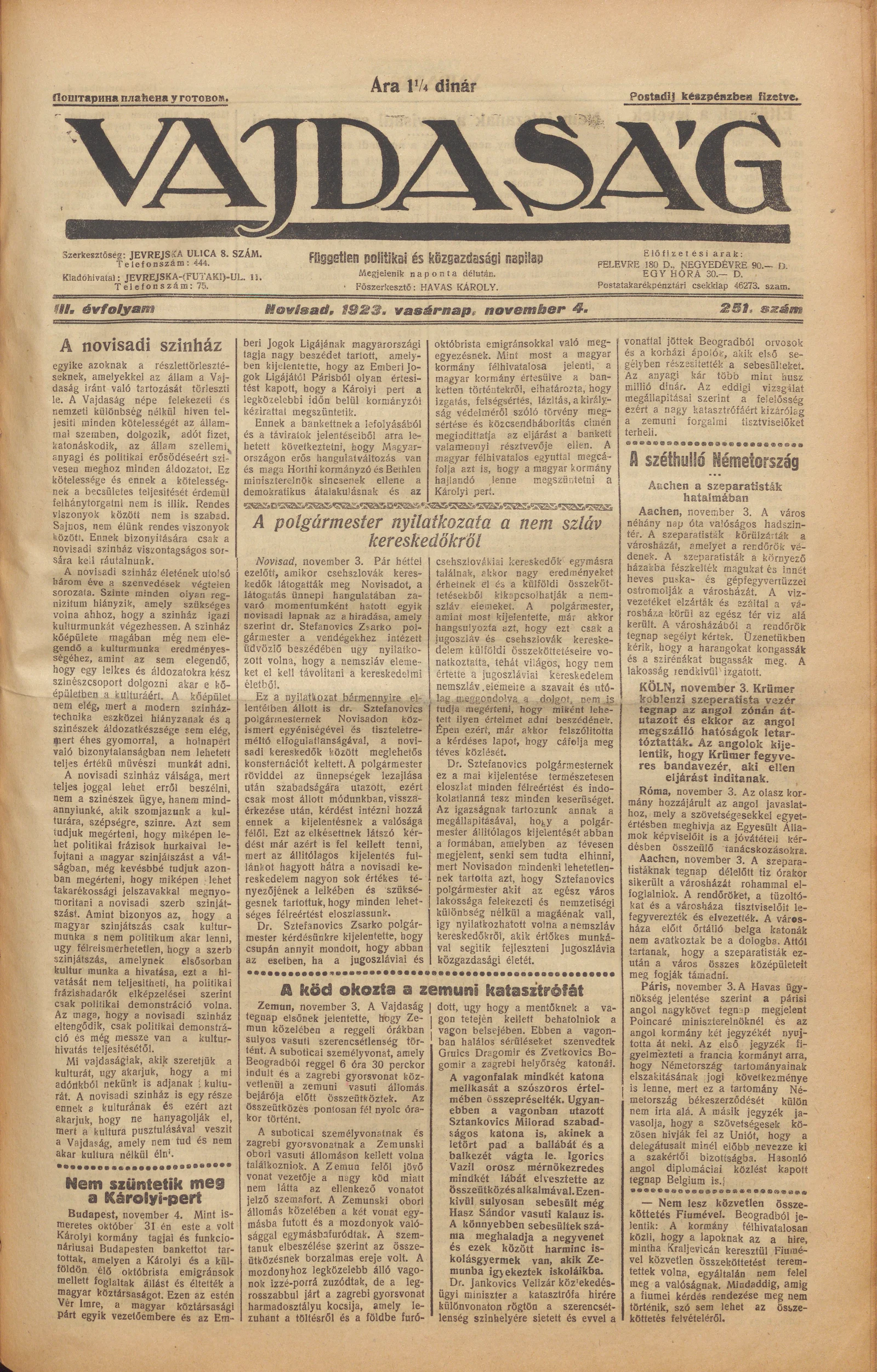 Vajdaság, 3. évf. 1923. november 4. 251. sz.