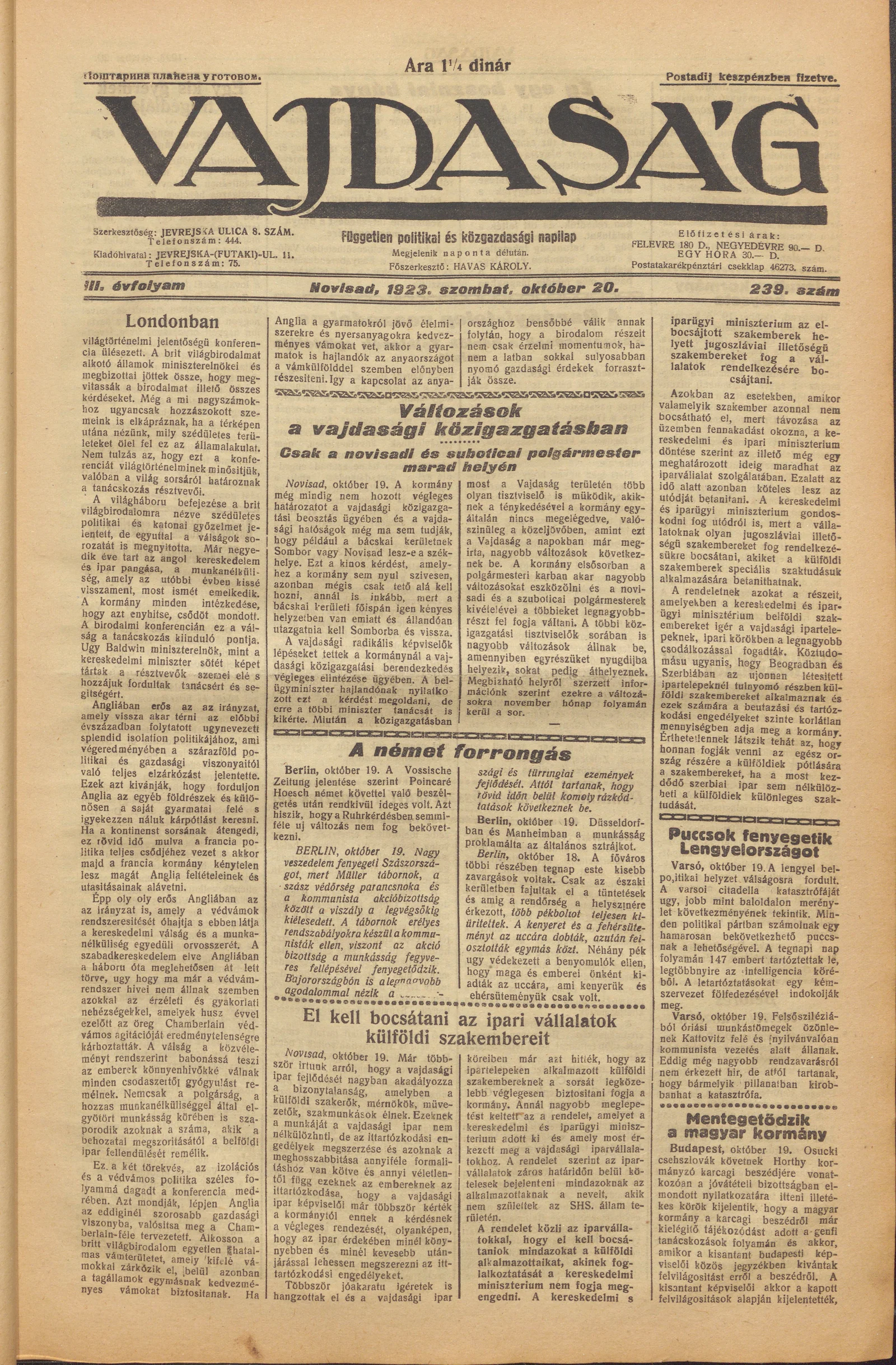 Vajdaság, 3. évf. 1923. október 20. 239. sz.