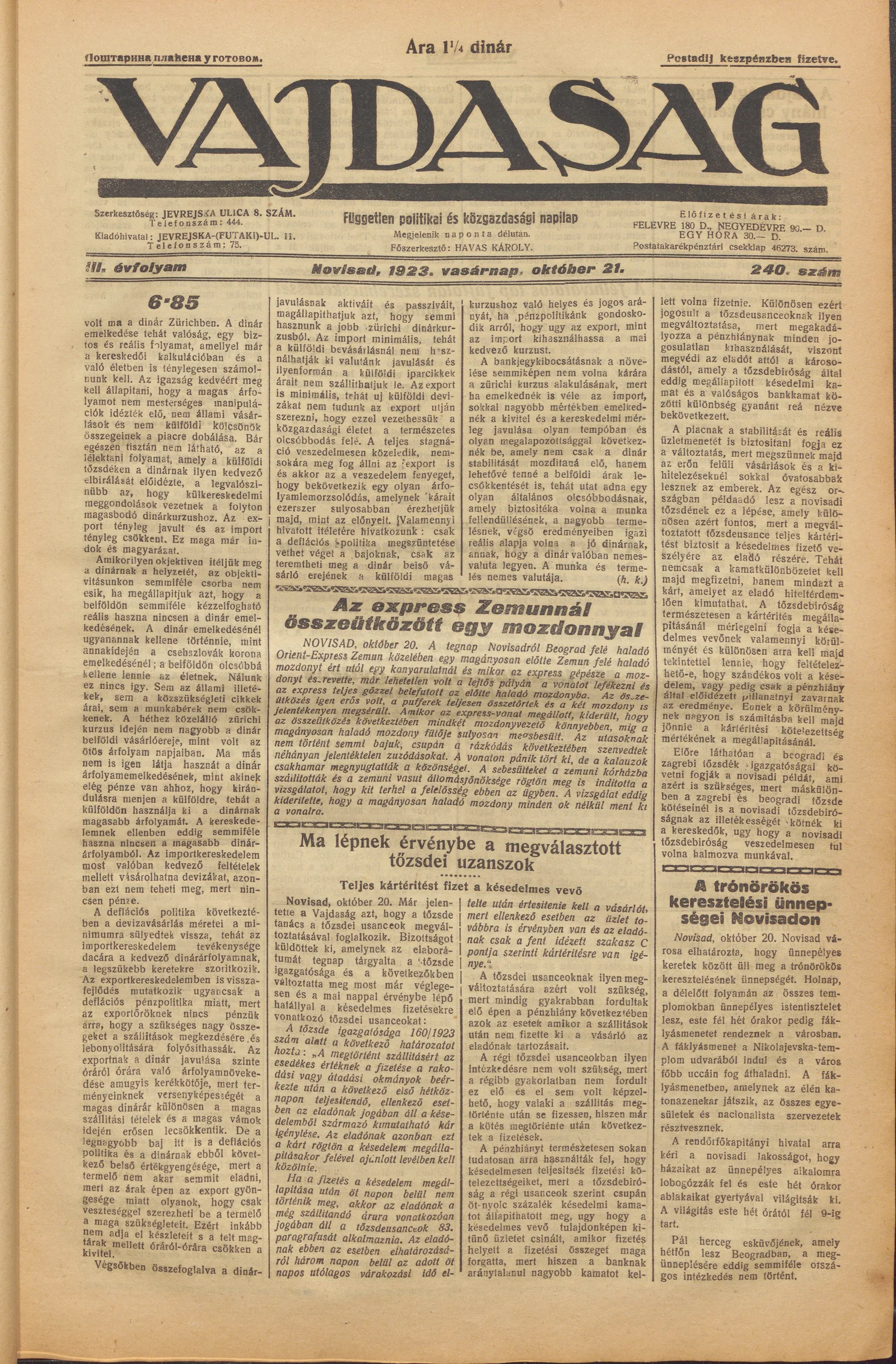 Vajdaság, 3. évf. 1923. október 21. 240. sz.