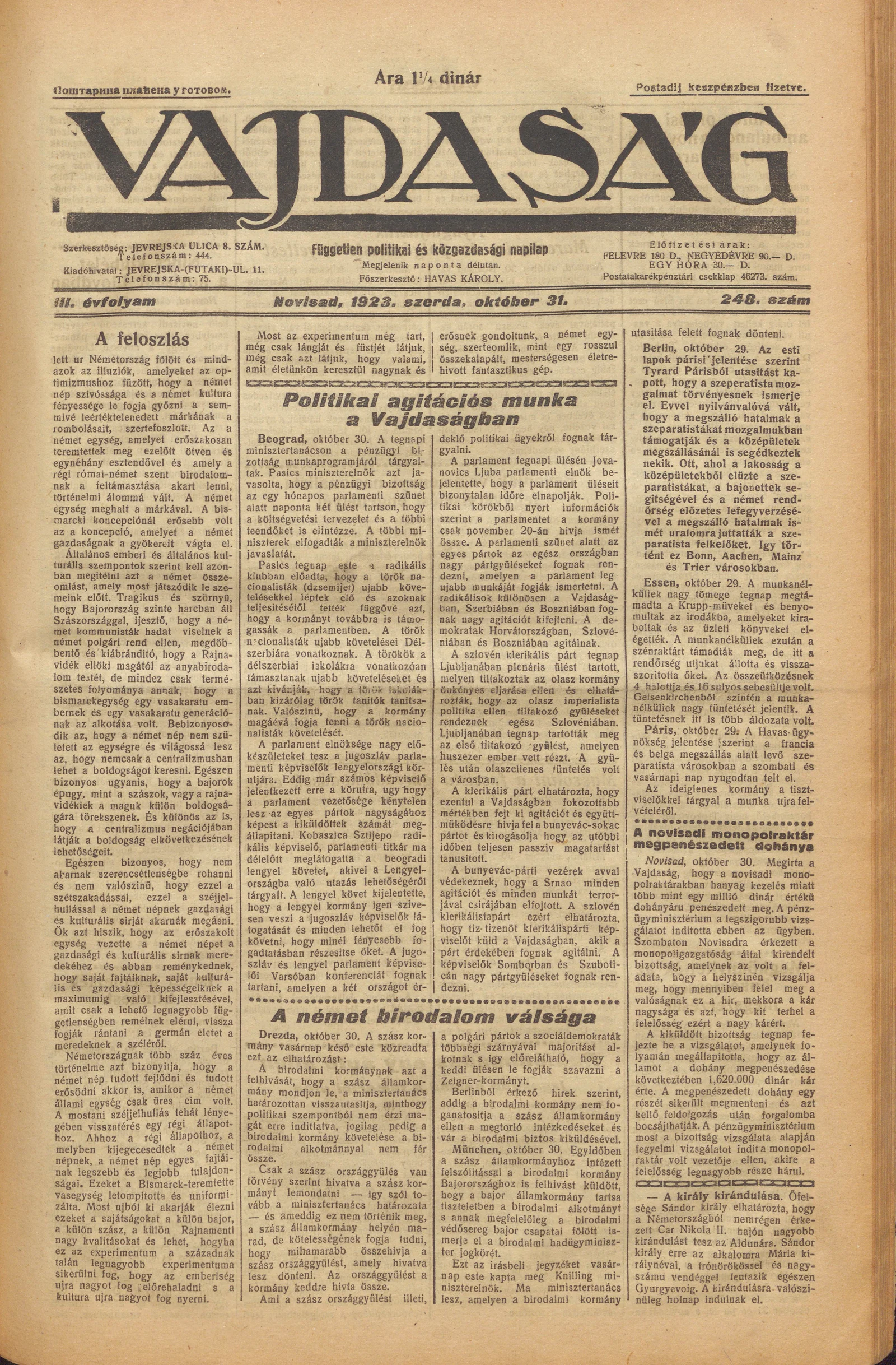 Vajdaság, 3. évf. 1923. október 31. 248. sz.