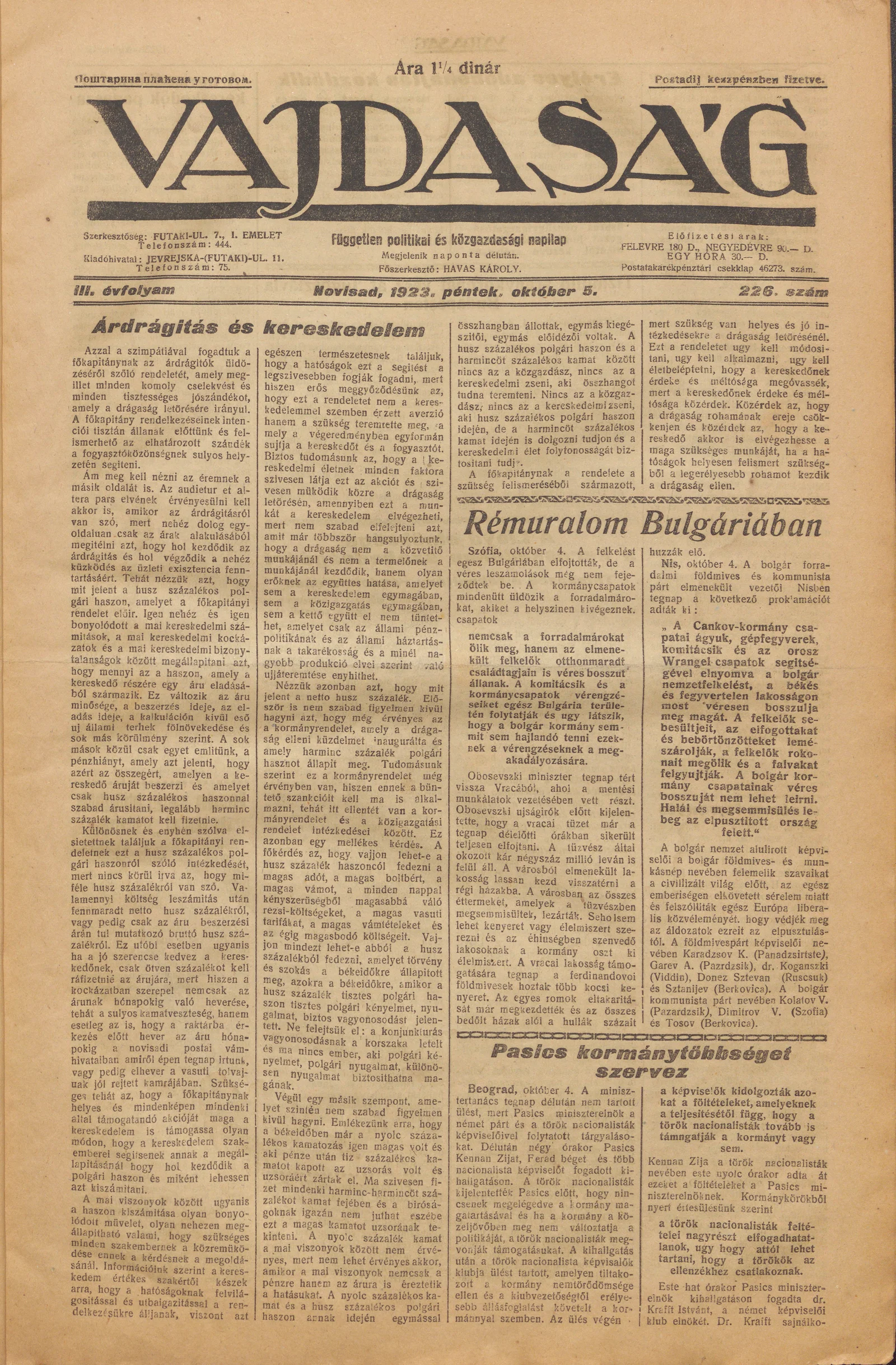 Vajdaság, 3. évf. 1923. október 5. 226. sz.