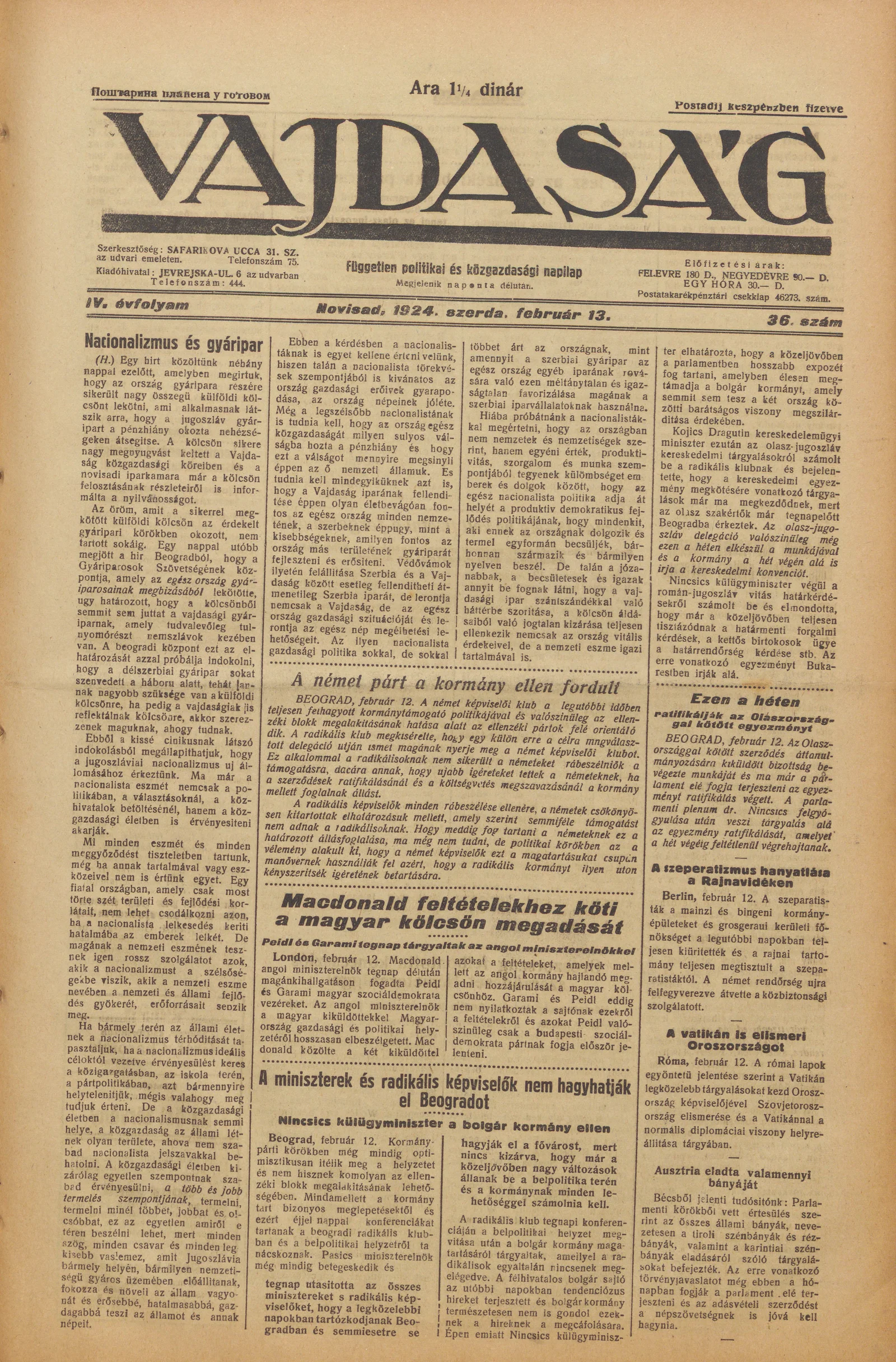 Vajdaság, 4. évf. 1924. február 13. 36. sz.