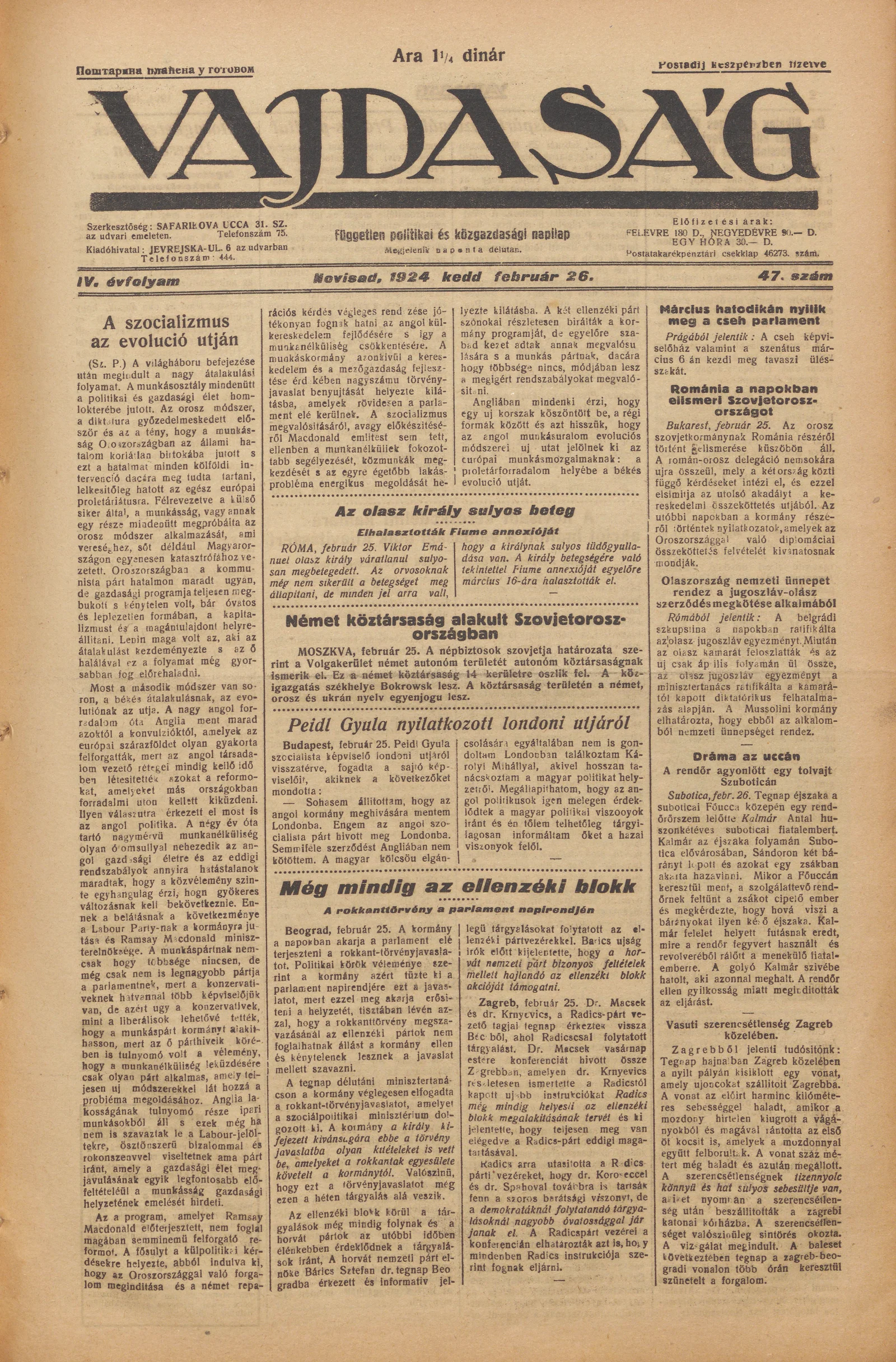 Vajdaság, 4. évf. 1924. február 26. 47. sz.
