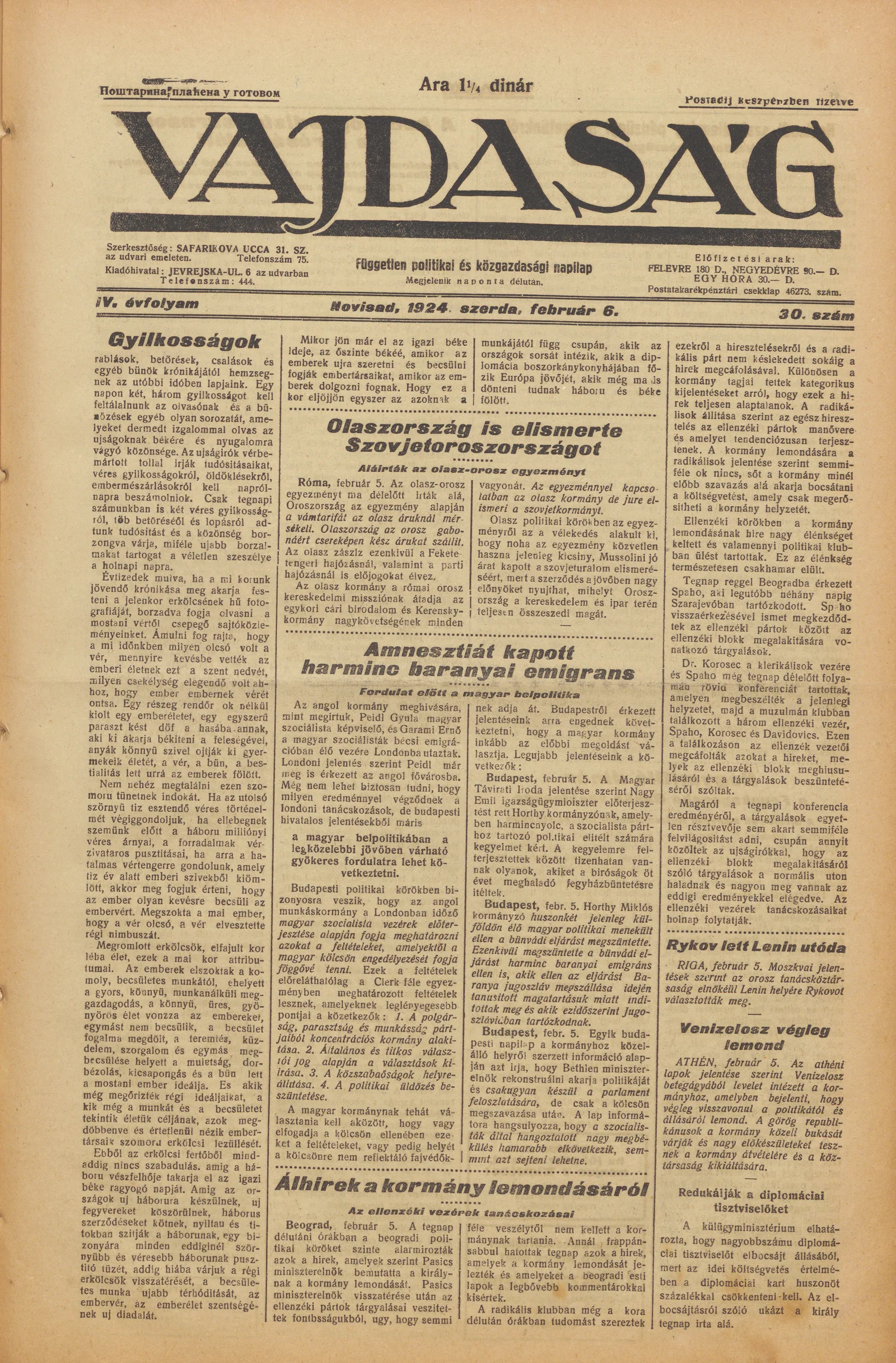 Vajdaság, 4. évf. 1924. február 6. 30. sz.