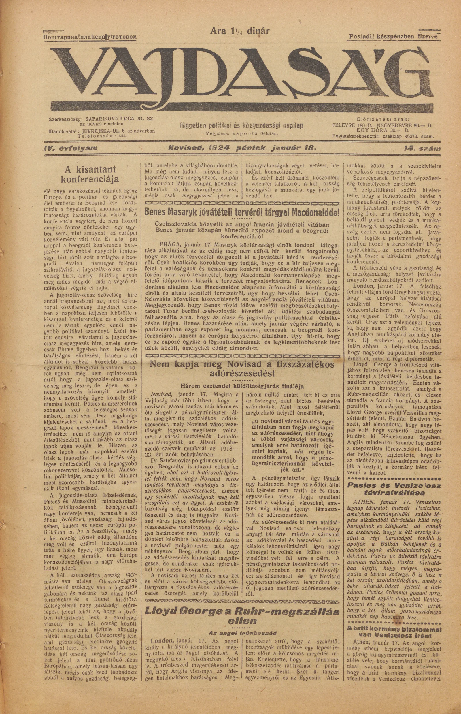 Vajdaság, 4. évf. 1924. január 18. 14. sz.
