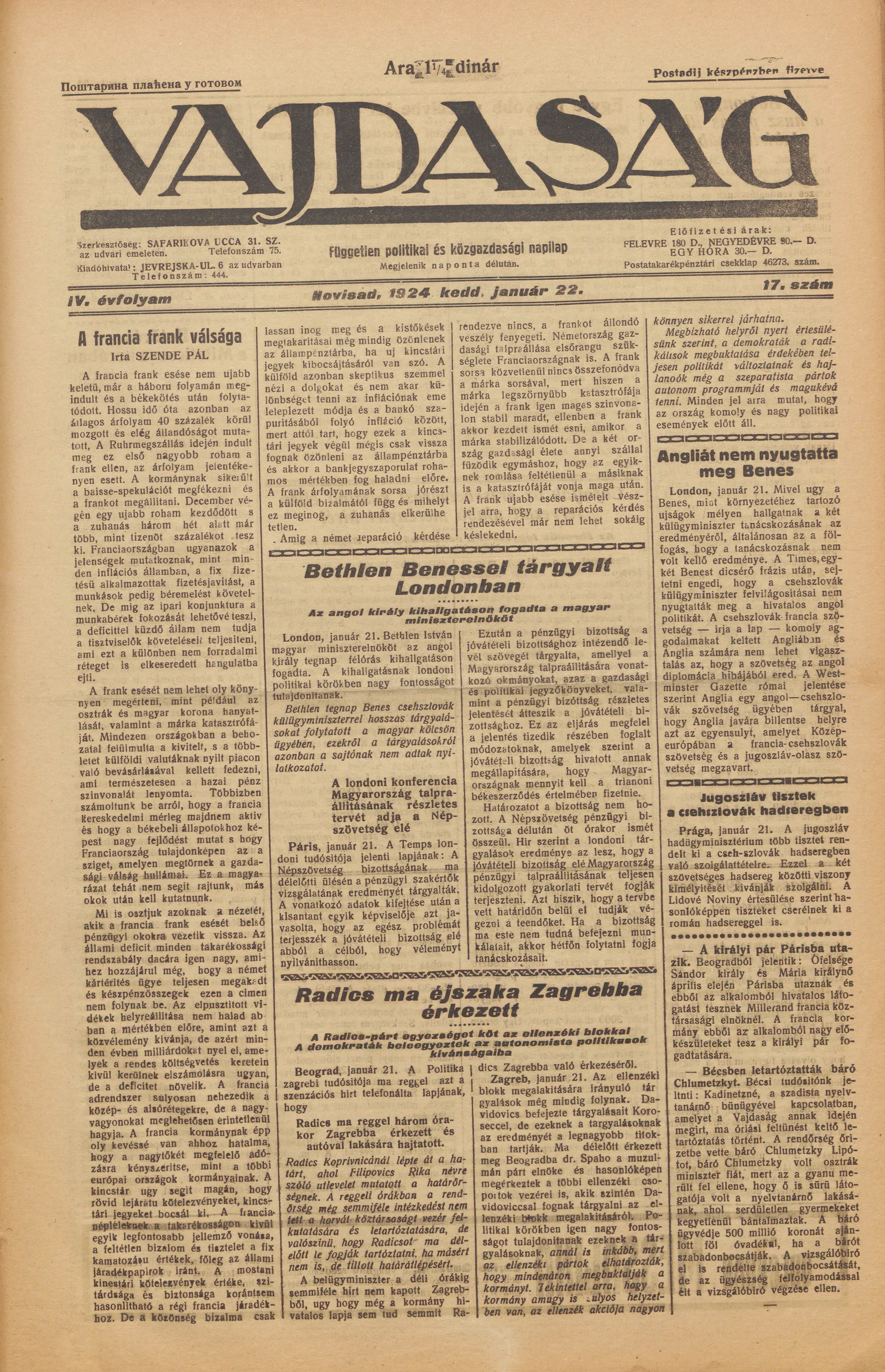 Vajdaság, 4. évf. 1924. január 22. 17. sz.