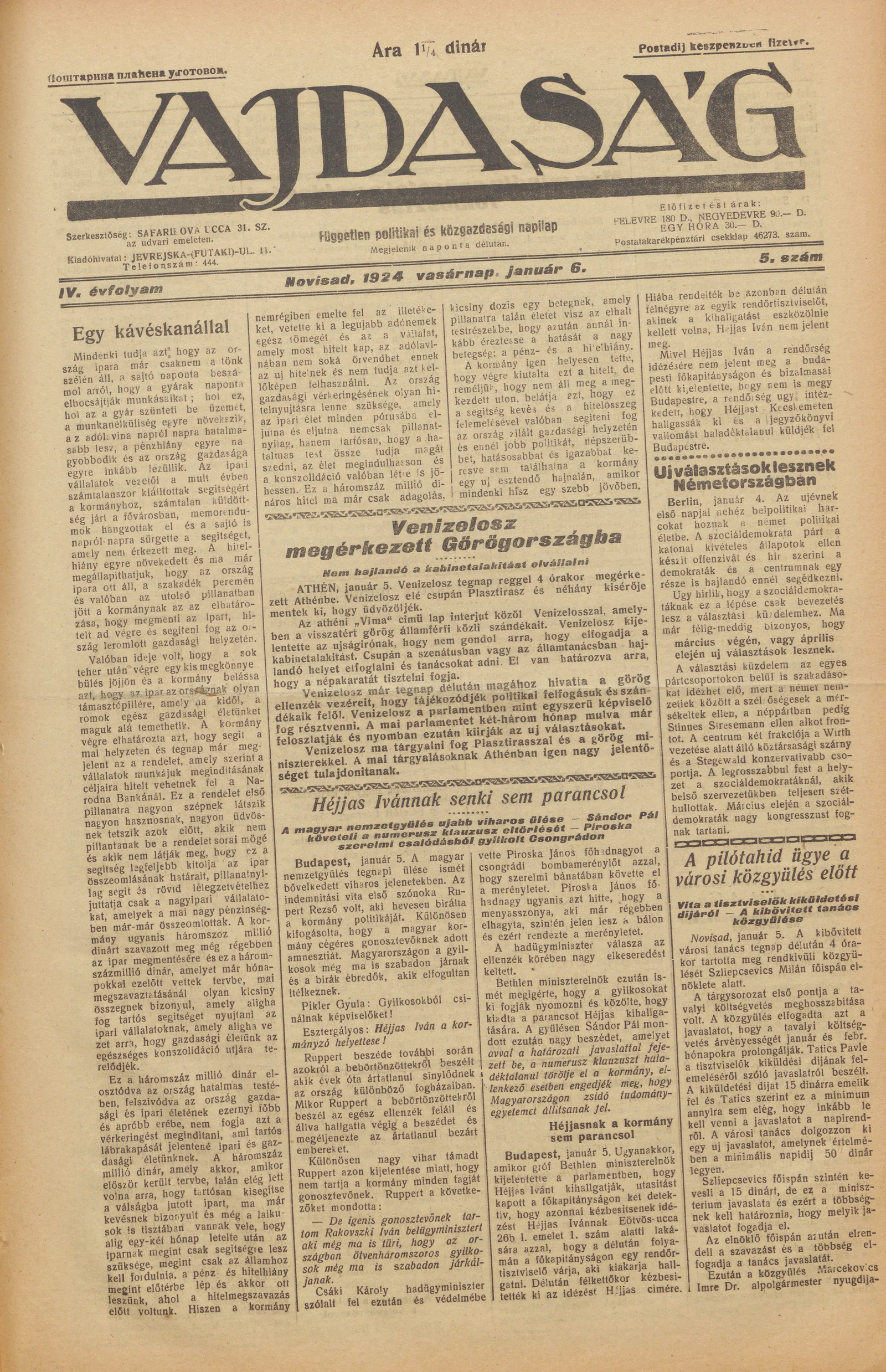 Vajdaság, 4. évf. 1924. január 6. 5. sz.