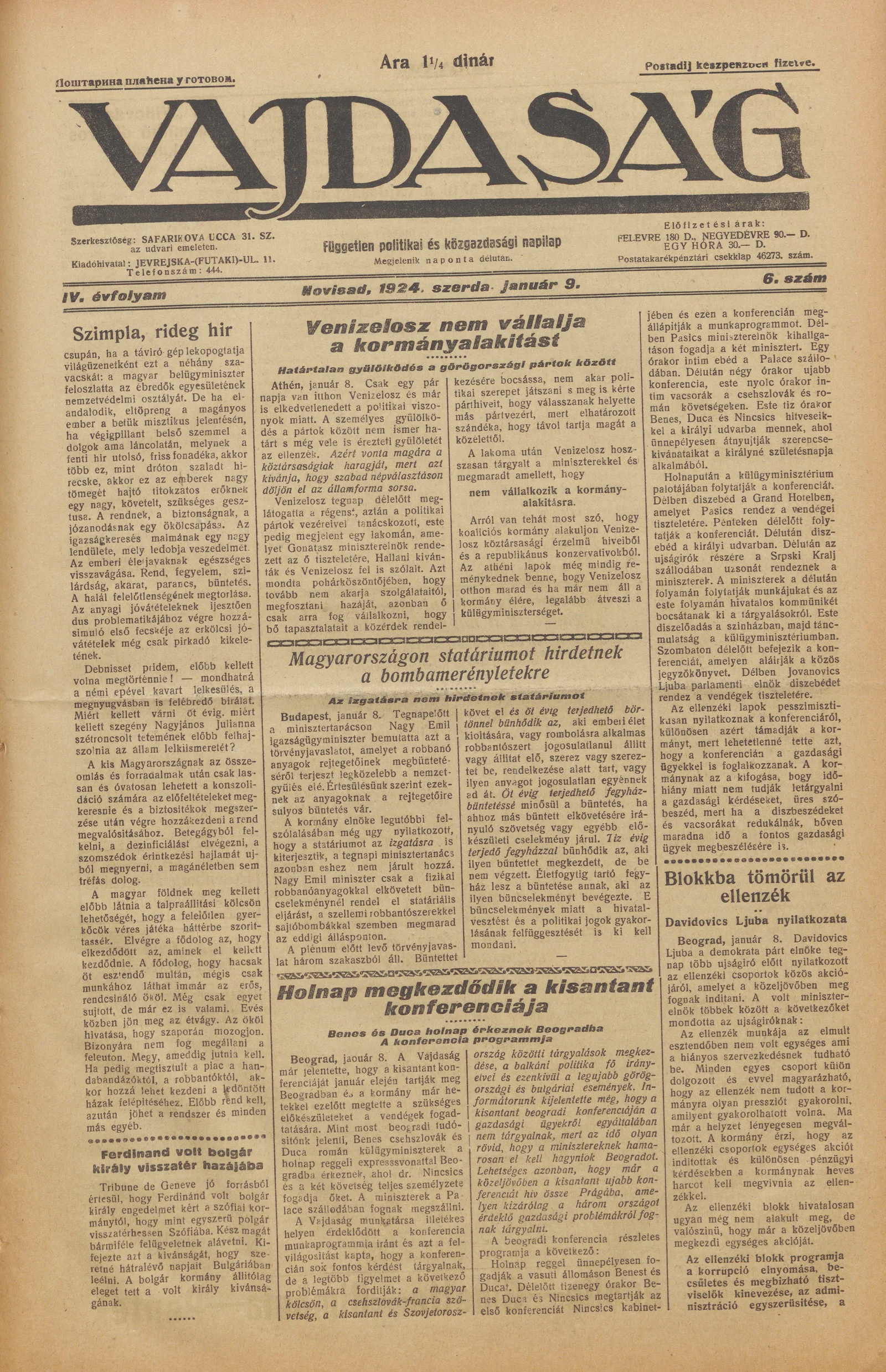 Vajdaság, 4. évf. 1924. január 9. 6. sz.